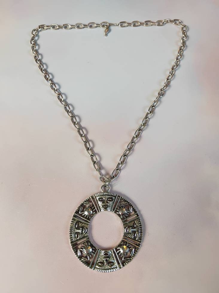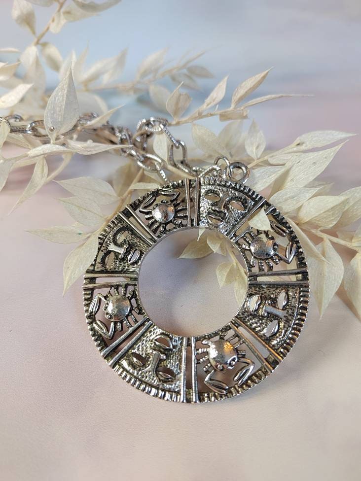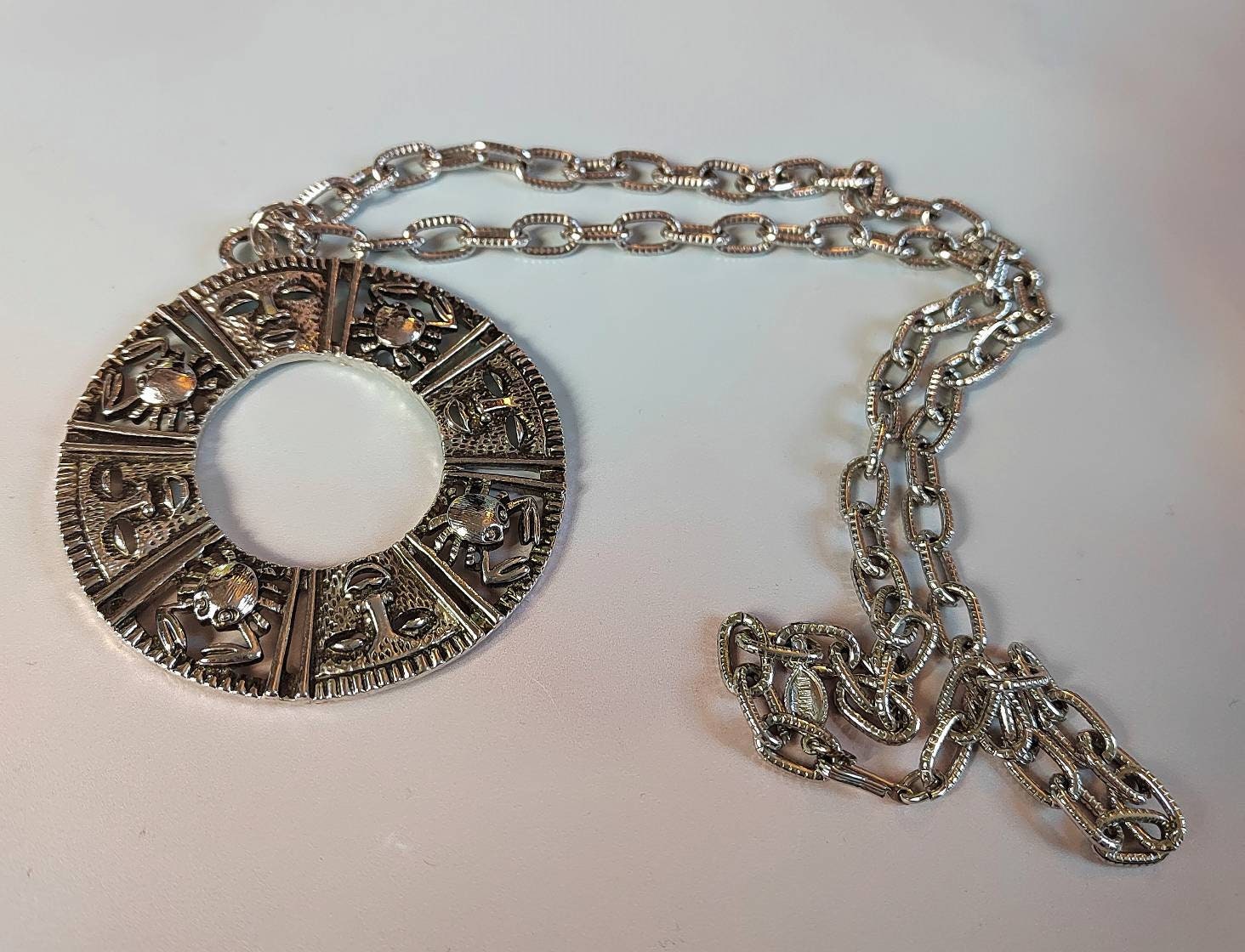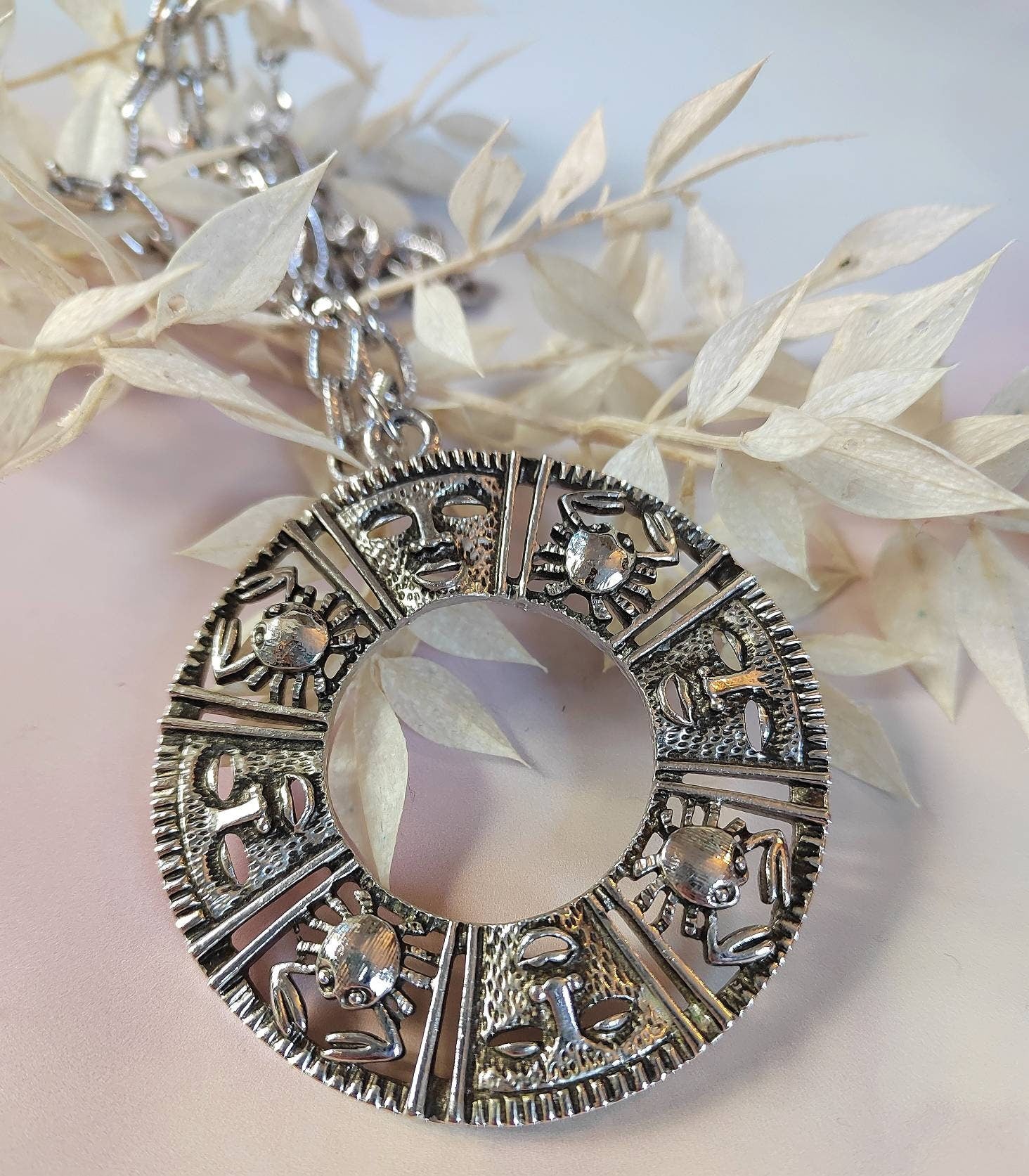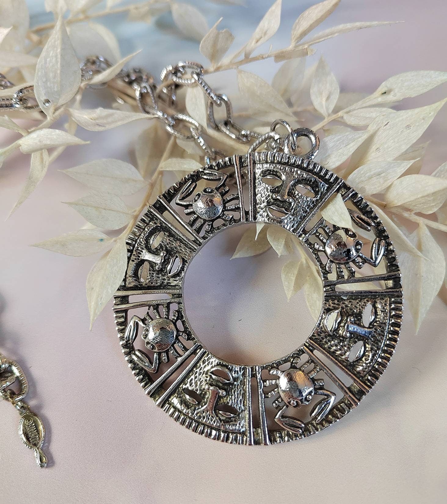 Beautiful and unusual 60's Sarah Coventry pendant necklace with cancer the crab and faces design silver tone pendant.