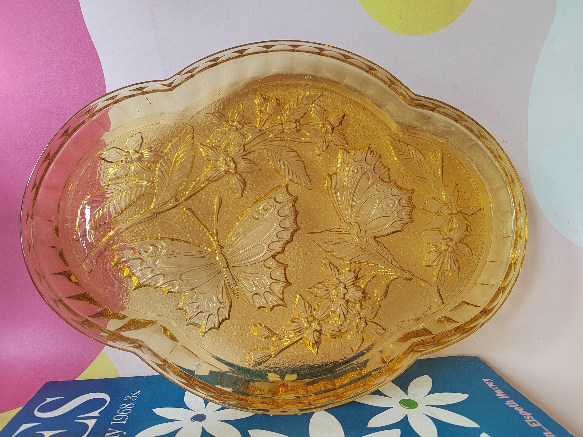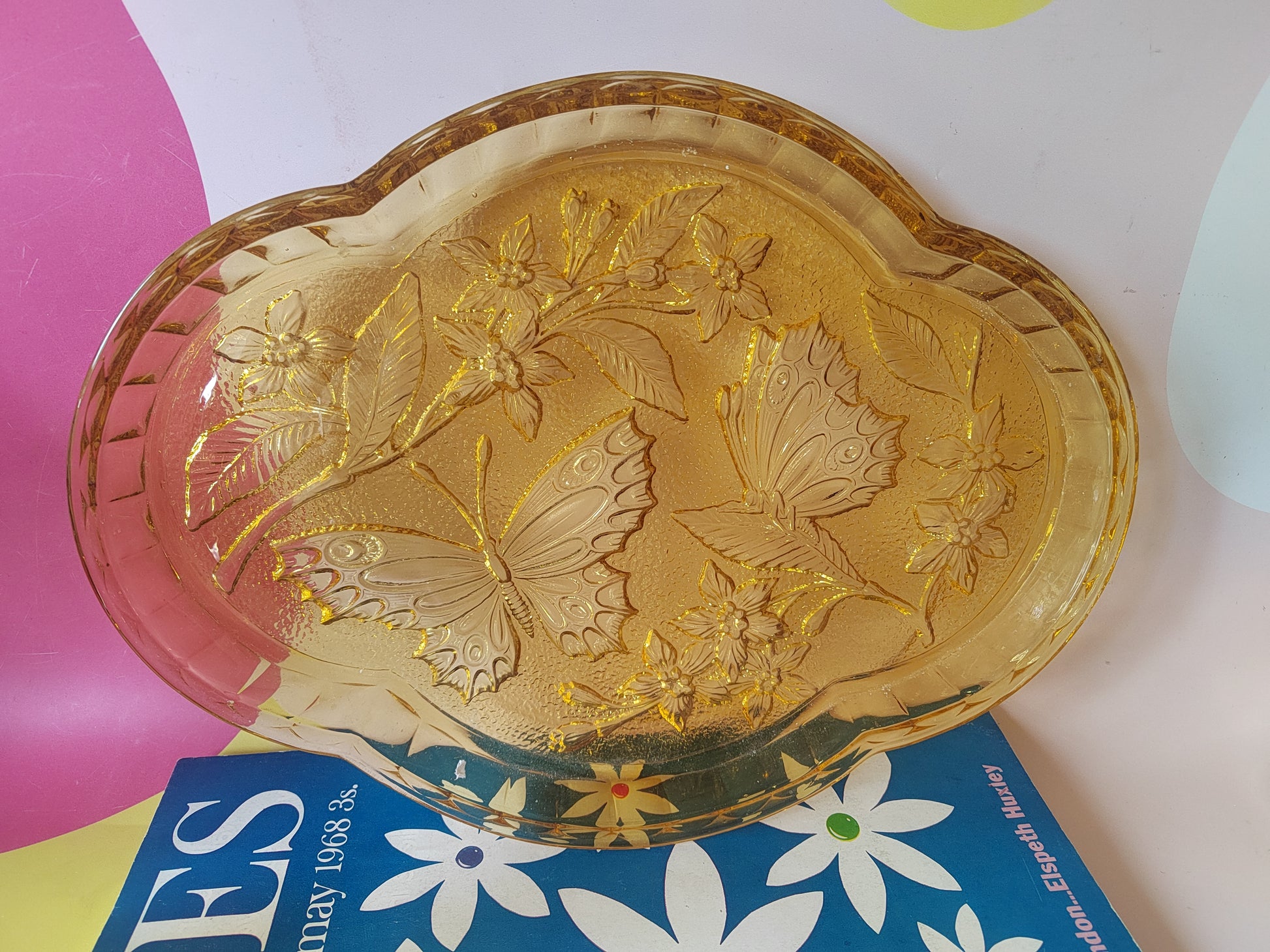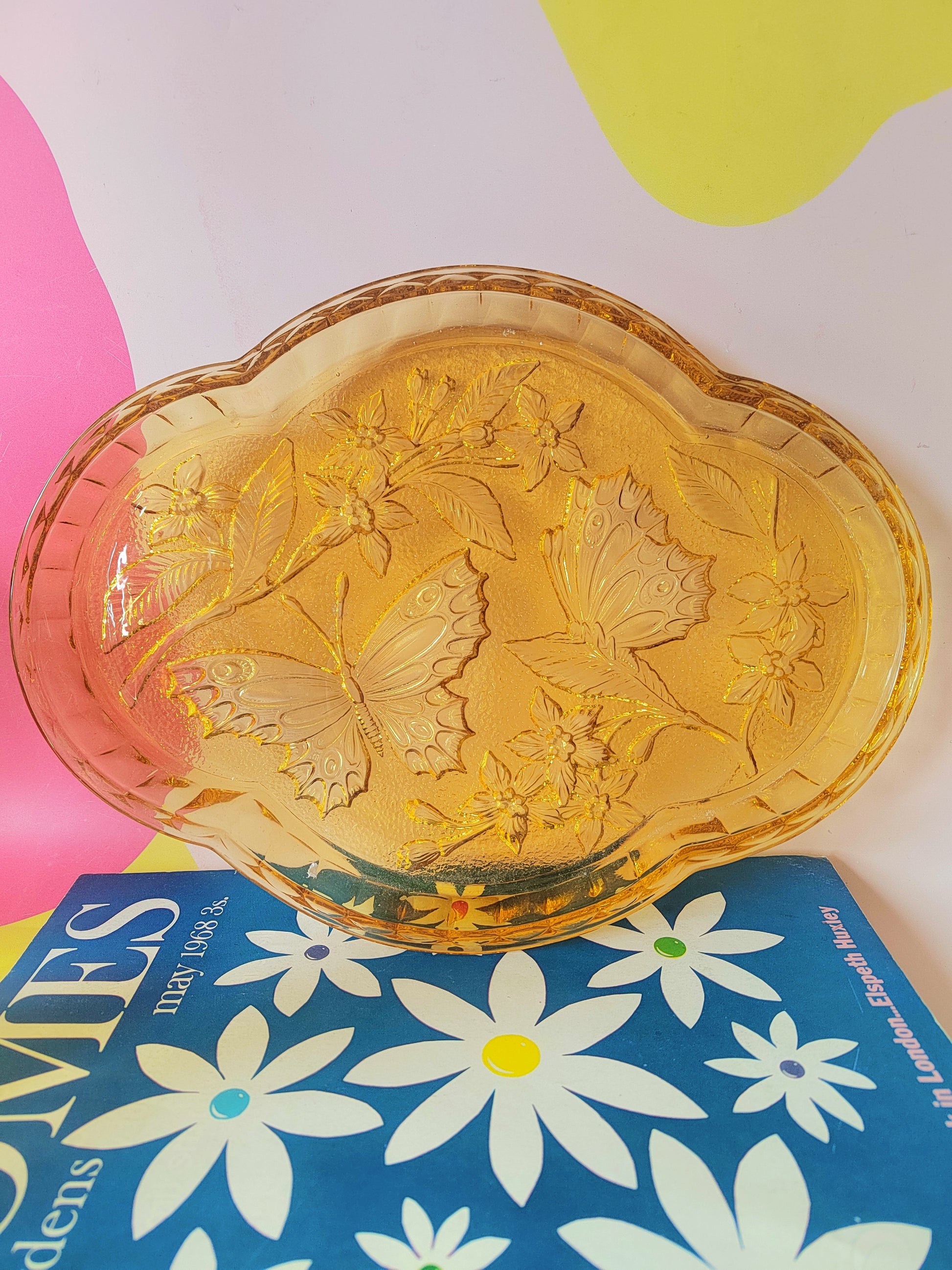 Beautiful vintage Amber pressed glass dressing table tray with butterfly design, perfect for trinkets and accessories.