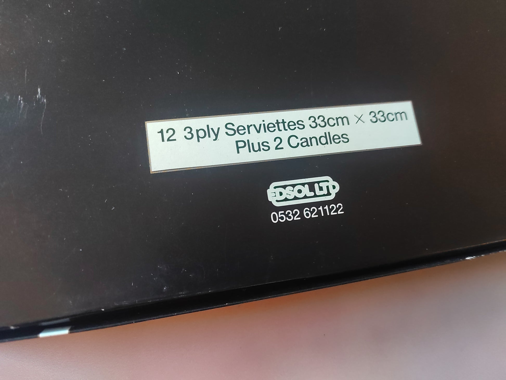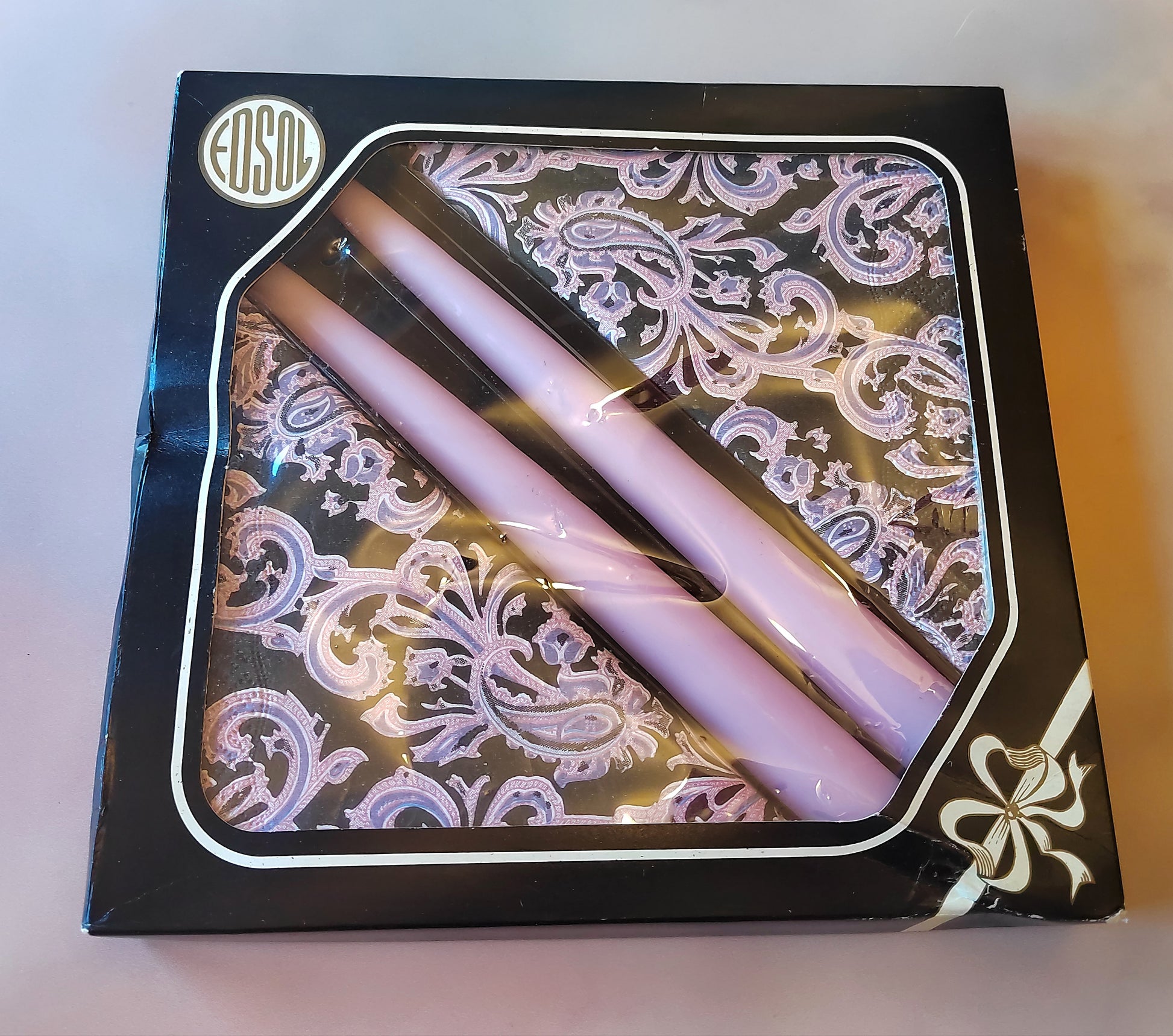 Lovely boxed set of 12 1970's paisley pattern black and purple napkins and a pair of lovely lilac tapered candles.