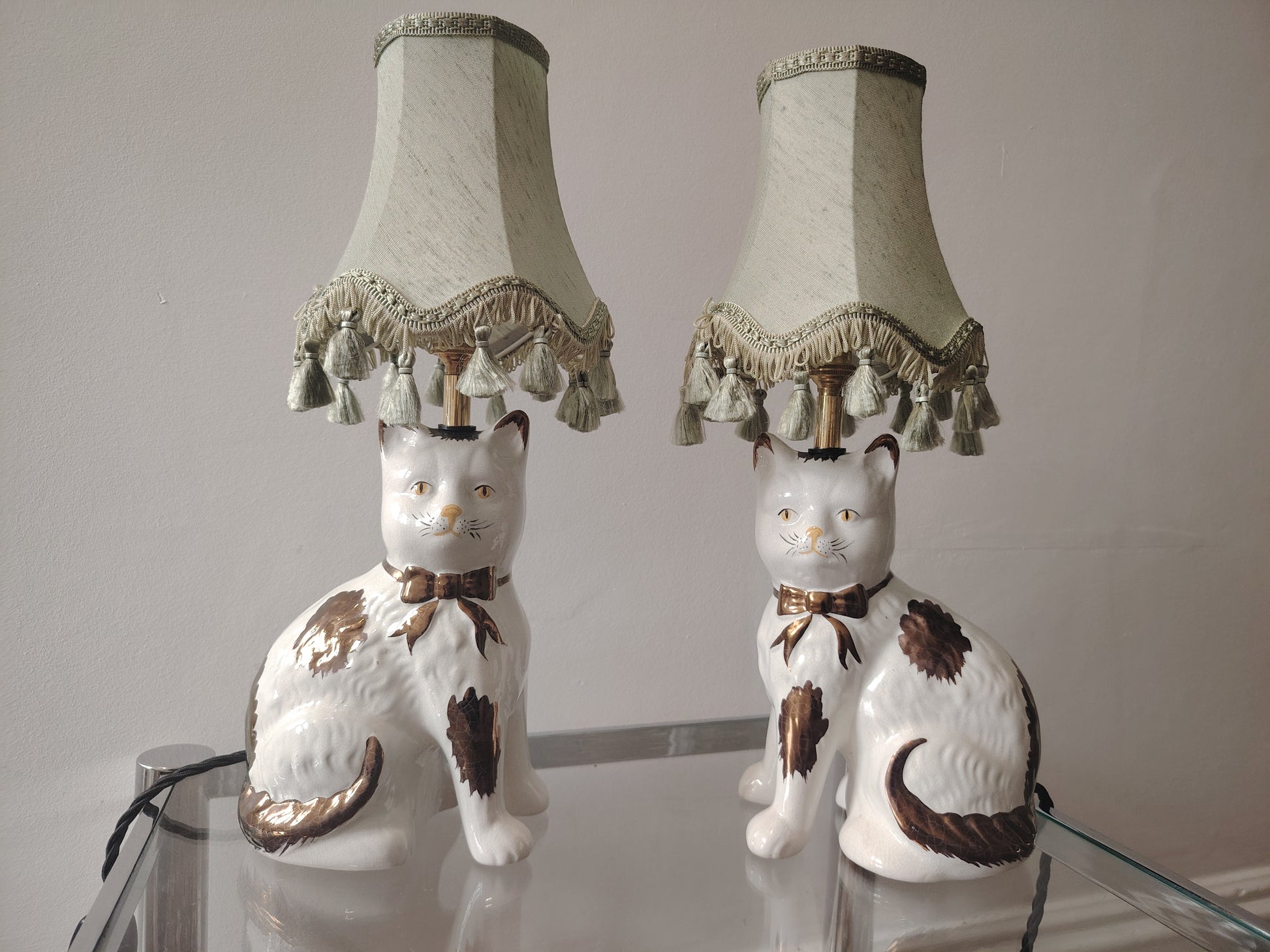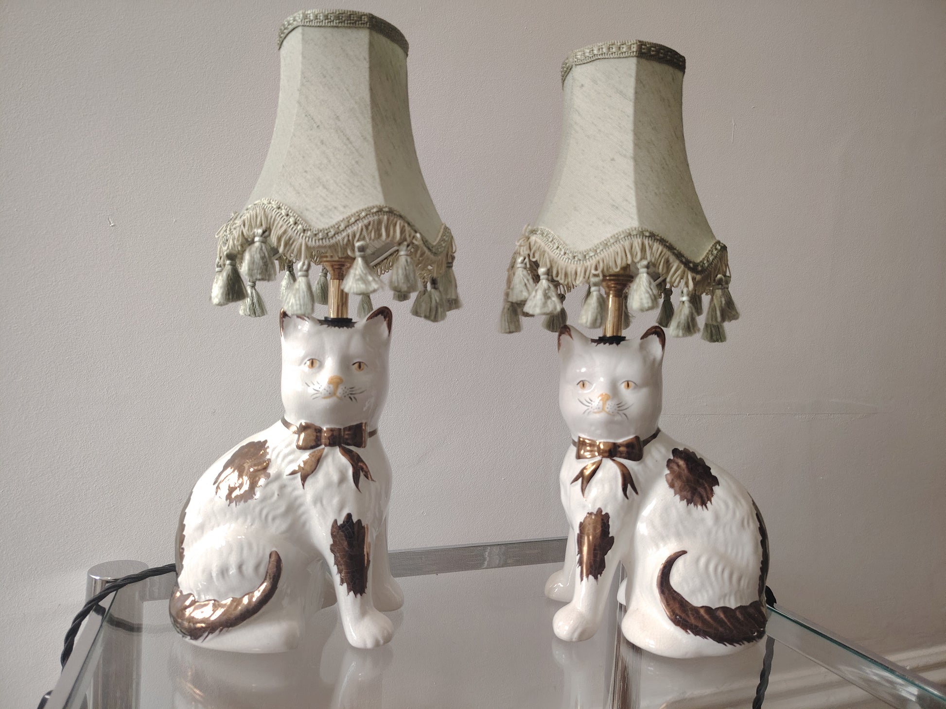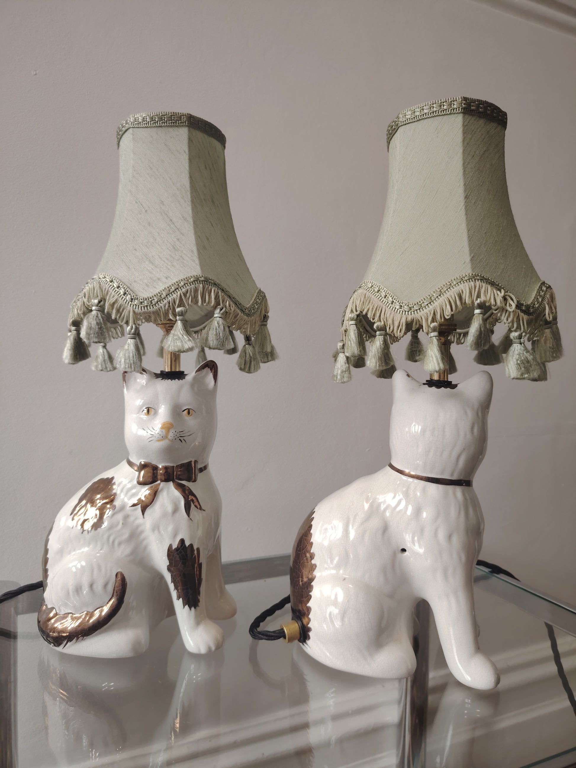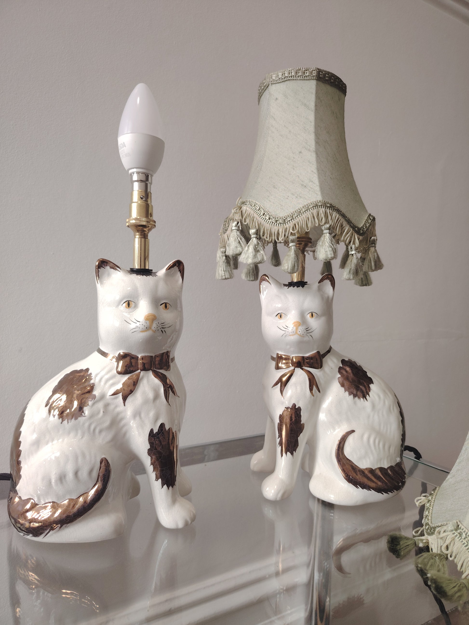 Amazing lamps made from a pair of beautiful vintage Staffordshire style mantle cats with bronze bows, complete with fabulous vintage clip on sage green tassled lampshades.