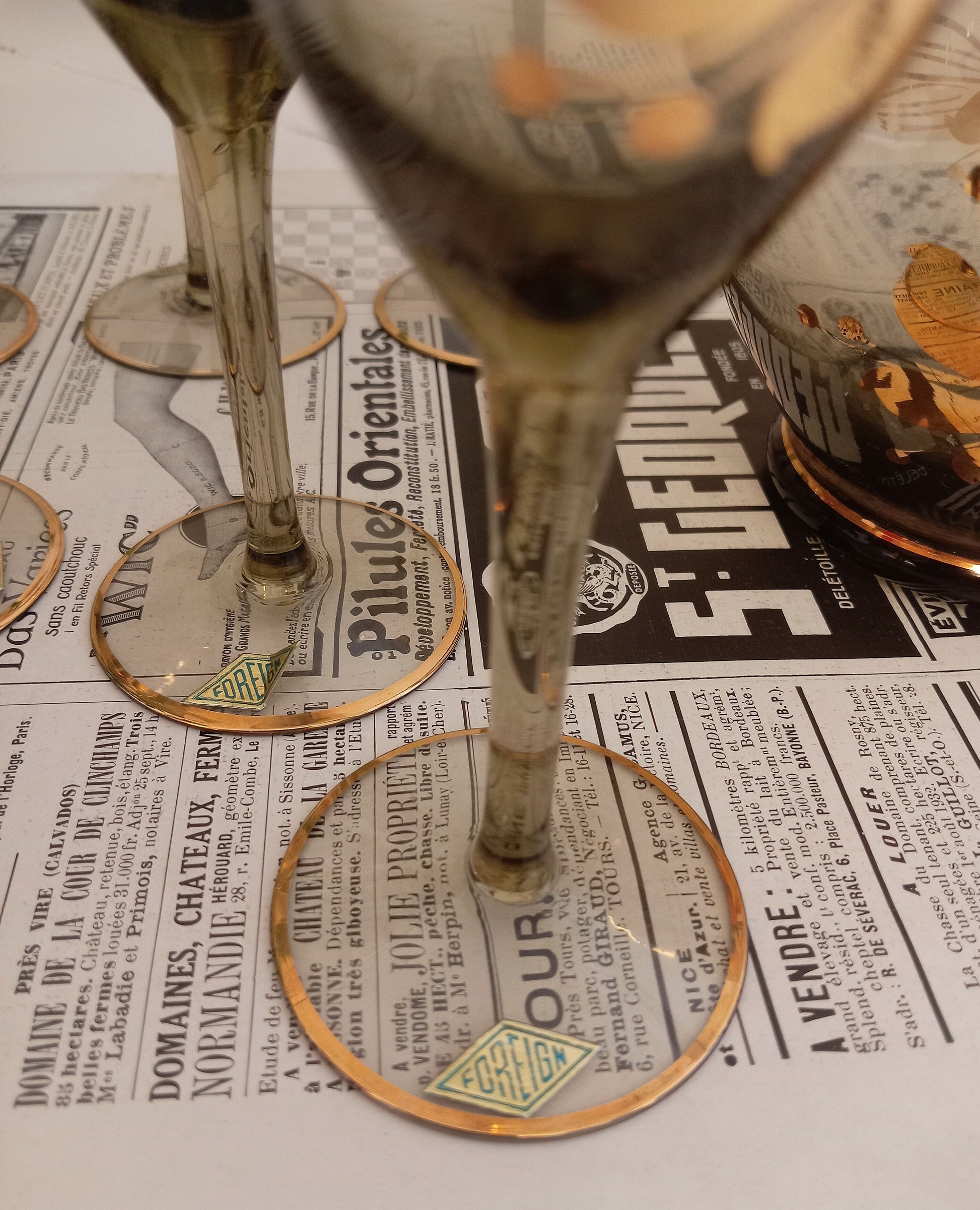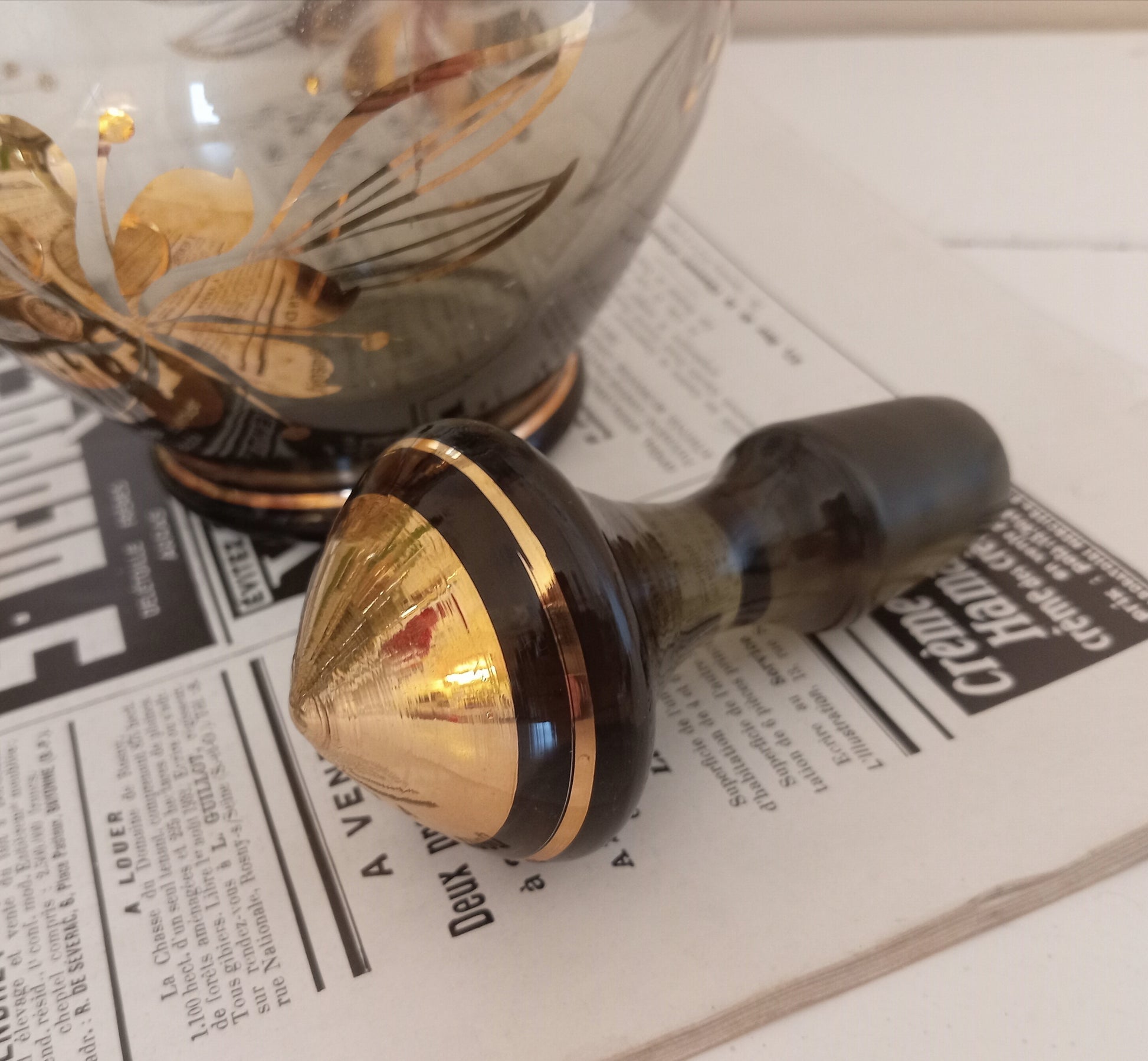 Stunning and unusual Mid Century Romanian smoked Glass Decanter set with gold floral design.