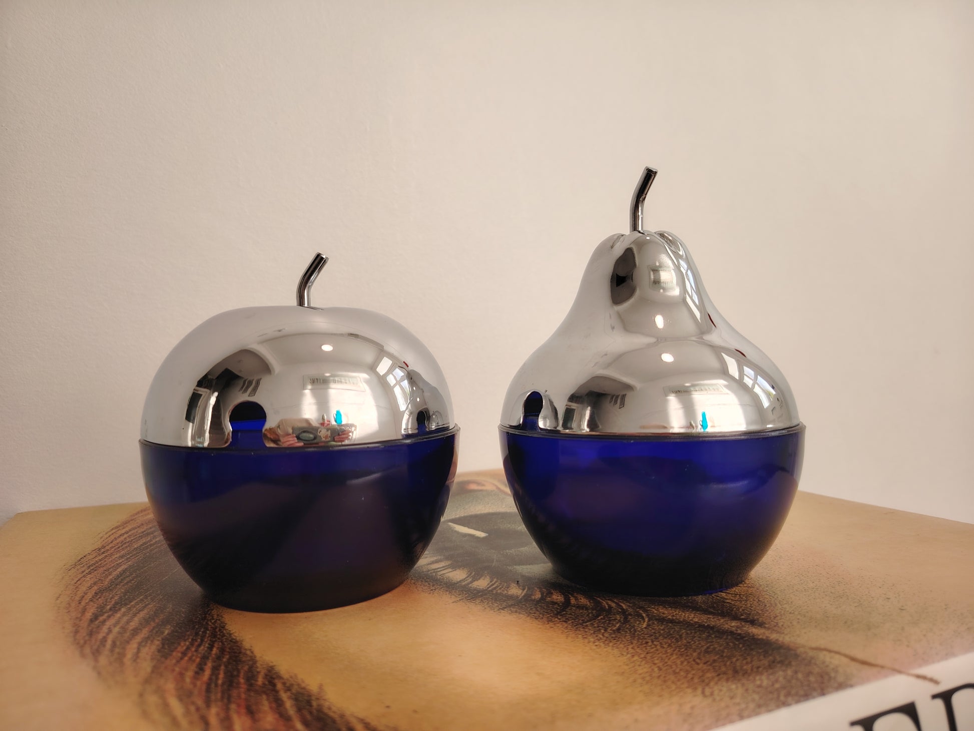 Pair of 70's cobalt blue glass and silver Apple and Pear pots