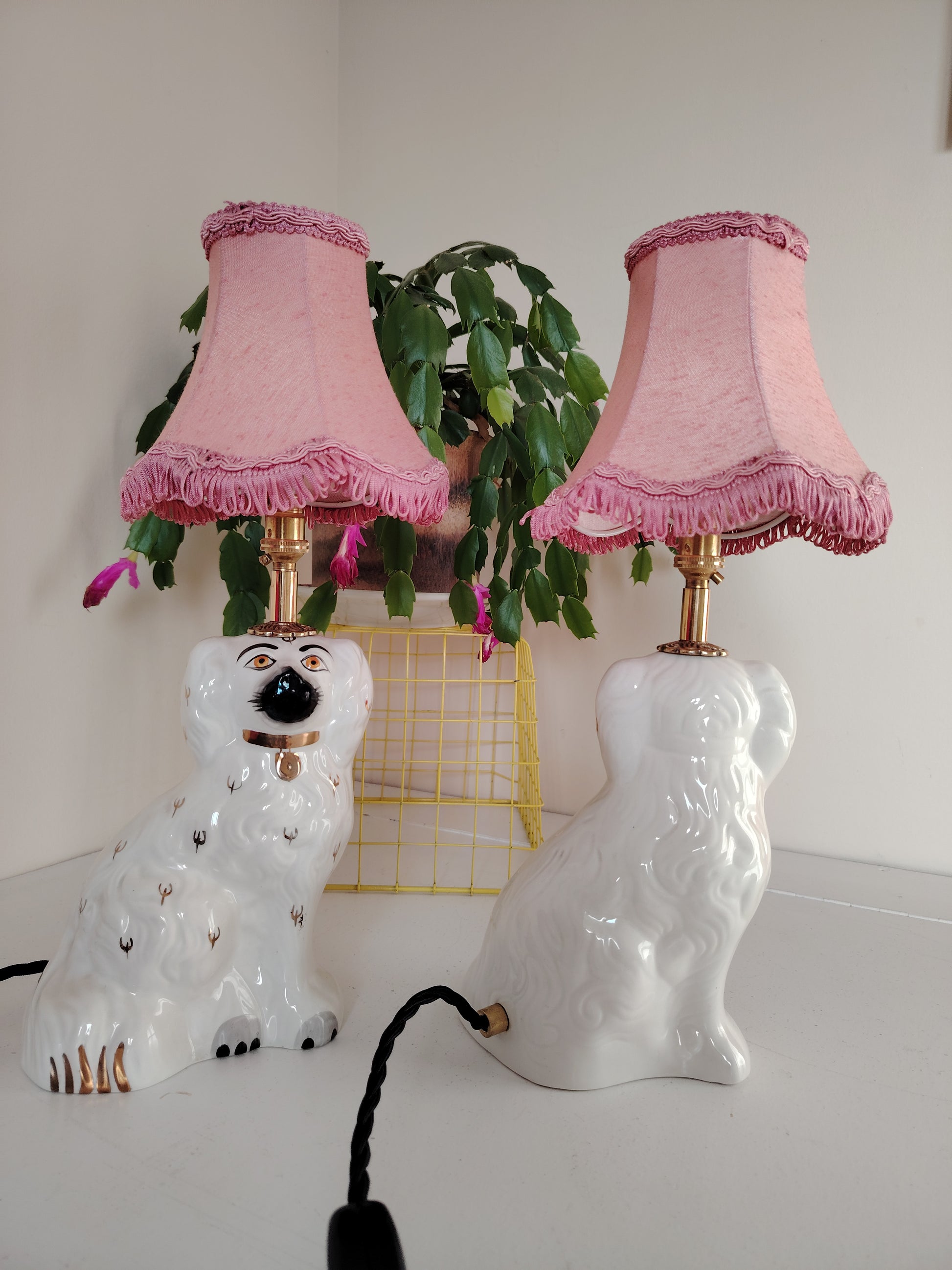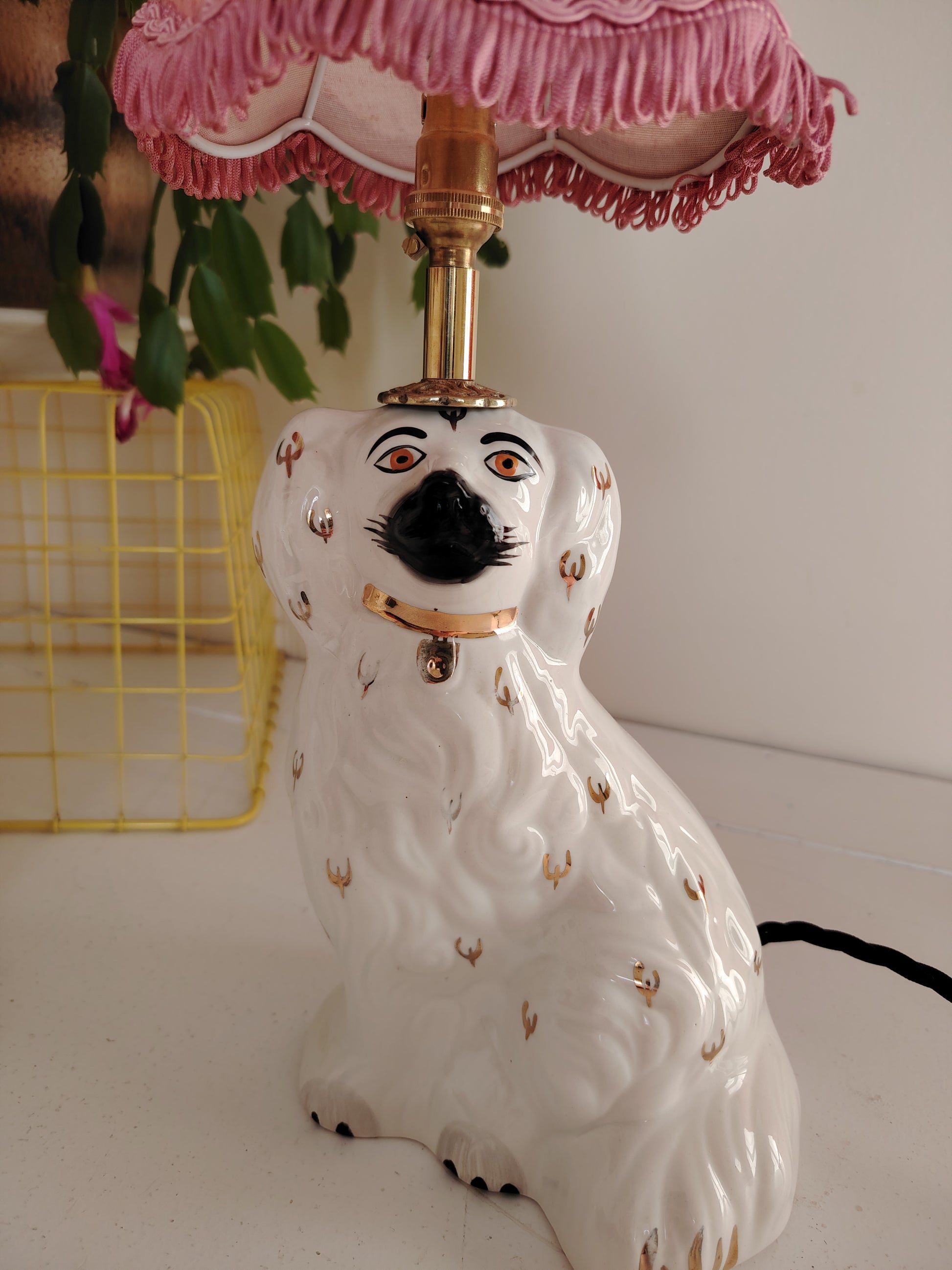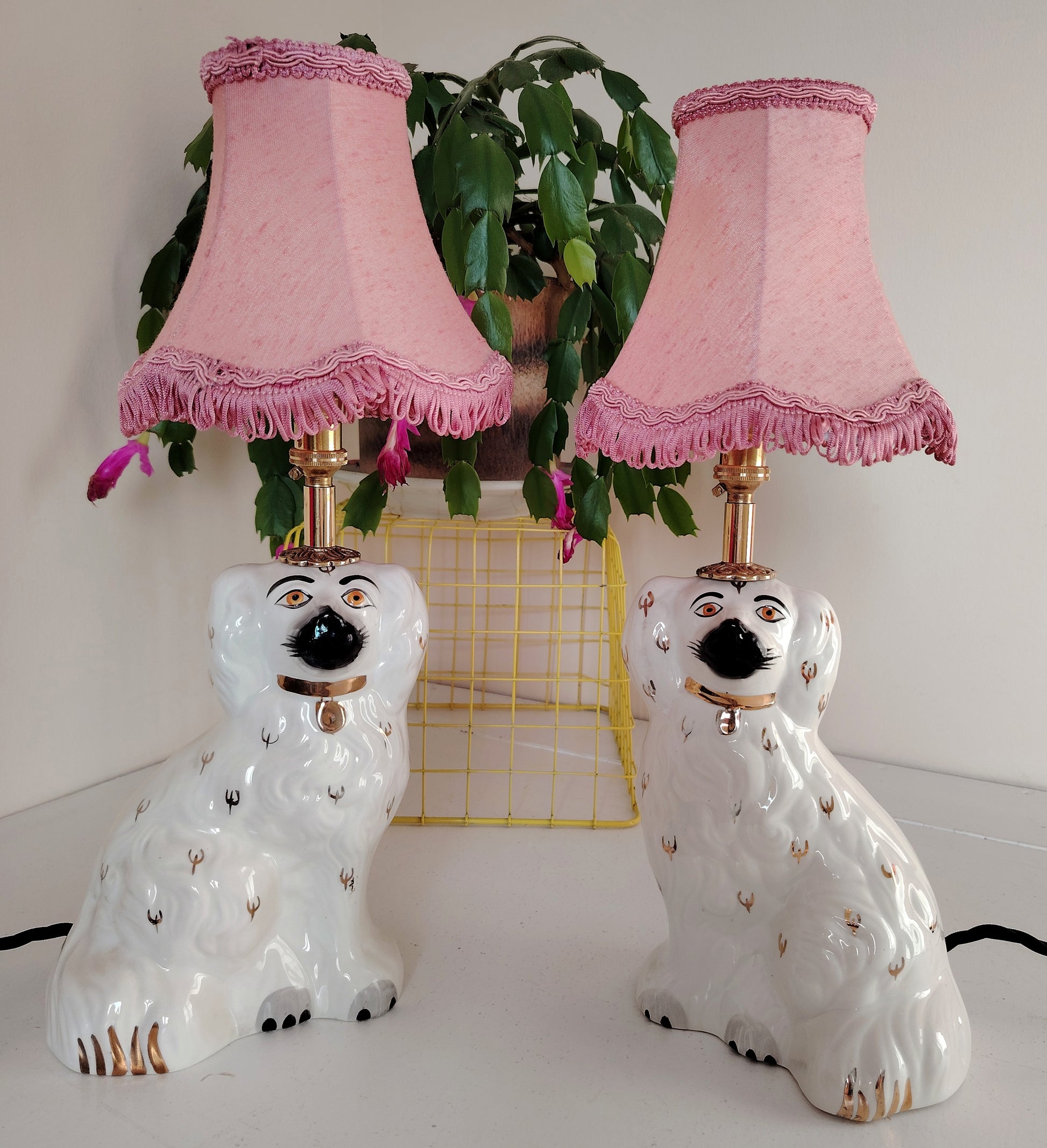 Amazing lamps made from a pair of antique Staffordshire style Spaniels with gold details, complete with fabulous vintage clip on pink tassled lampshades.