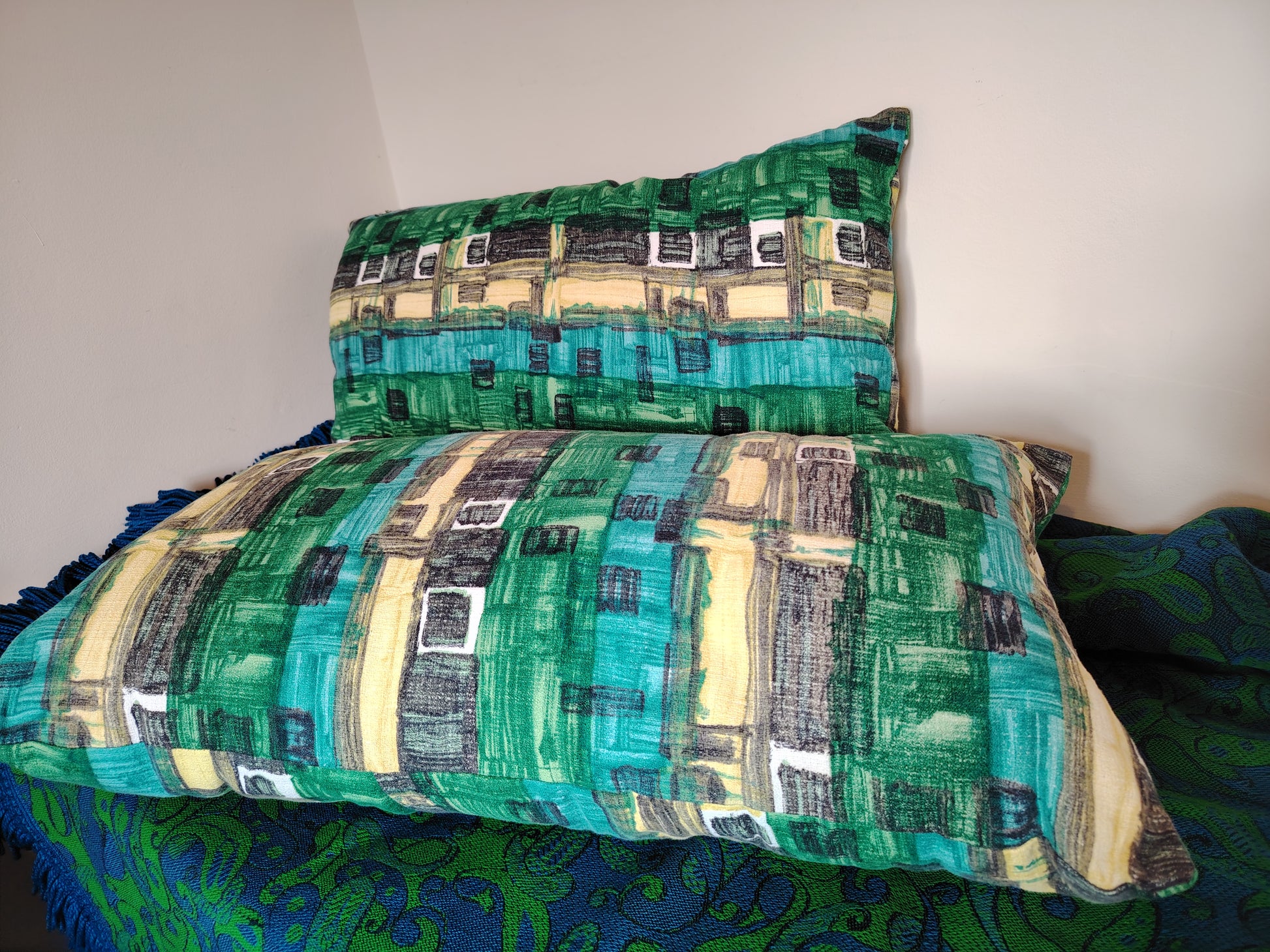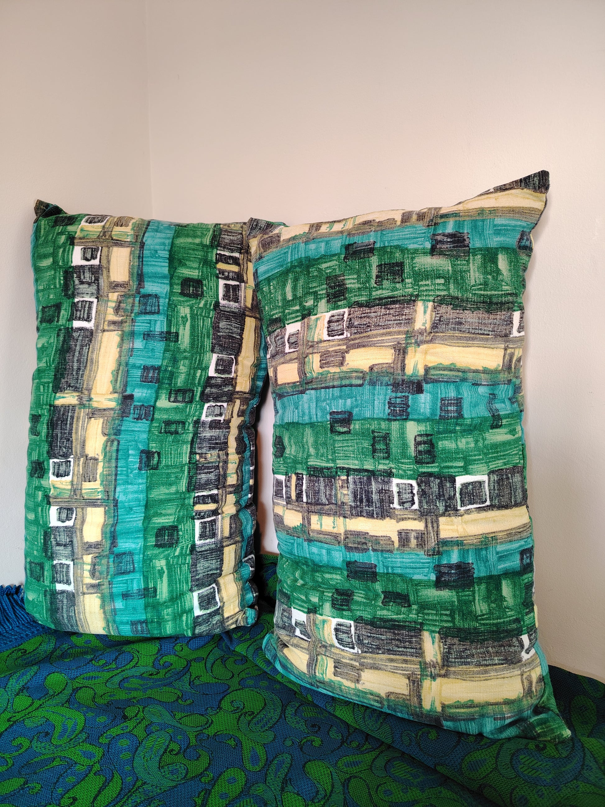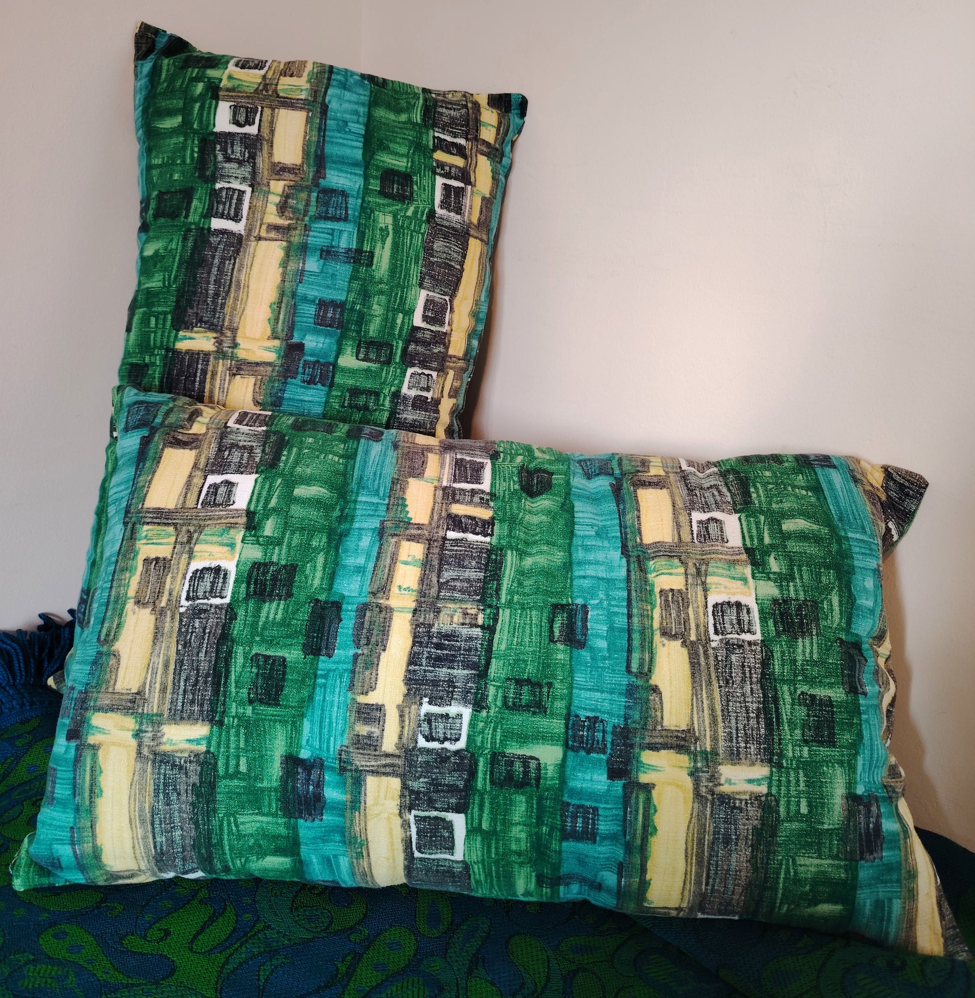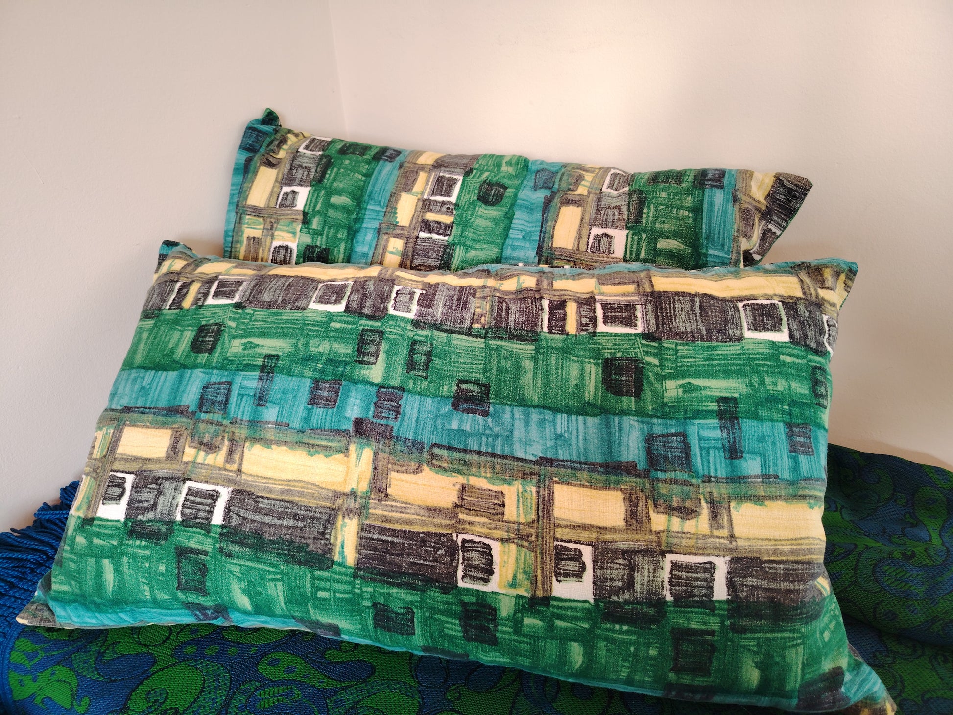 Stunning pair of large bolster cushions made from 1950's bark cloth material in beautiful blues, greens and yellows.