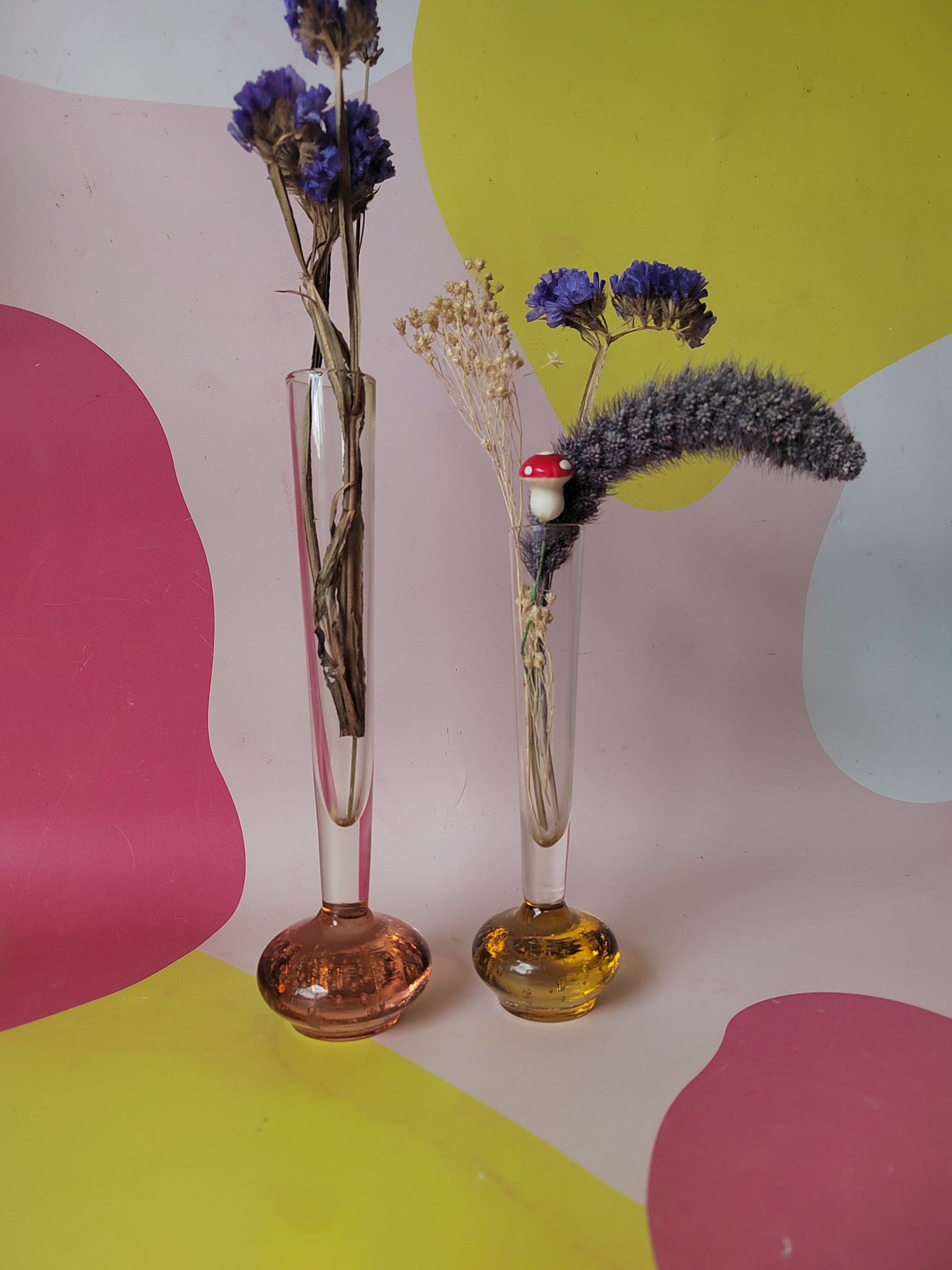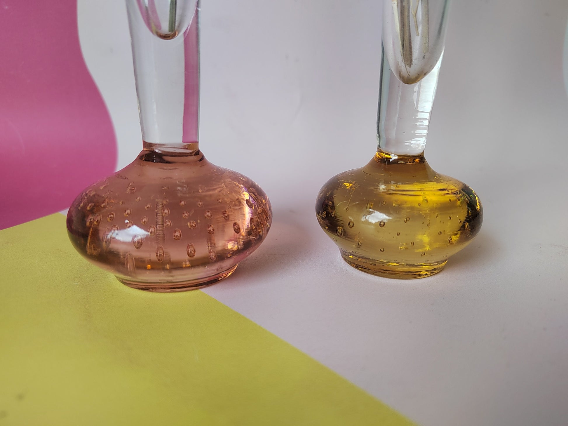 Lovely pair of vintage bubble bud vases, one with an amber base and one with a pink base.
