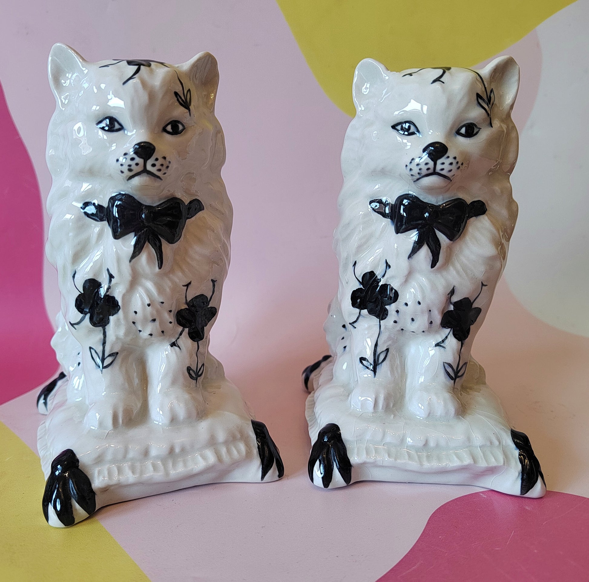 Stunning pair of black and white ceramic mantle cats on cushions with sweet faces.