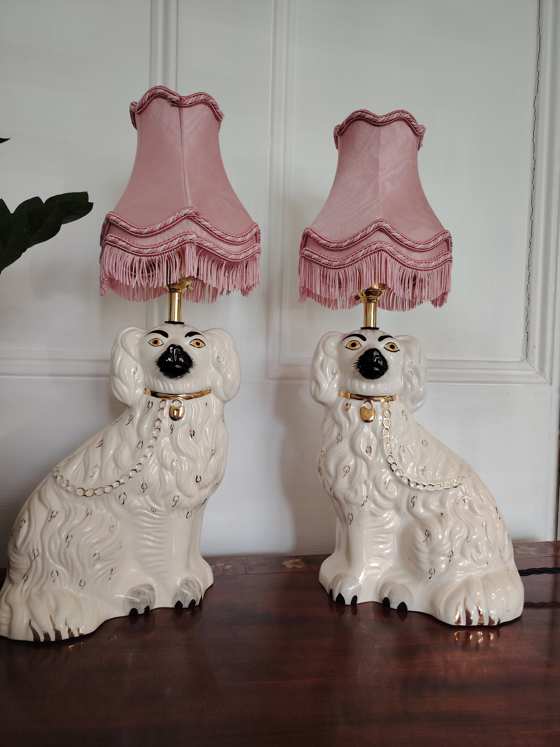 Amazing lamps made from a pair of iconic Beswick flat backed Spaniels with gold details, complete with fabulous vintage clip on pink tassled lampshades.