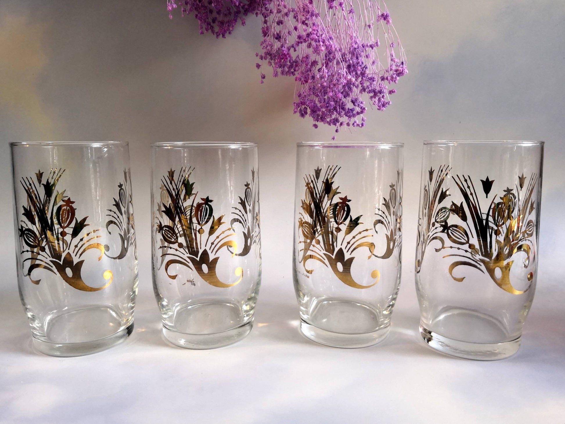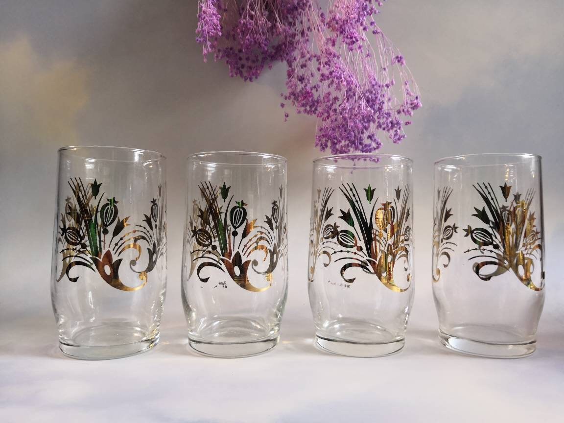 Set of 4 1950's drinking glasses with gold flower bouquet design