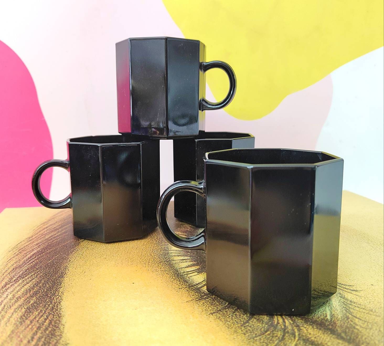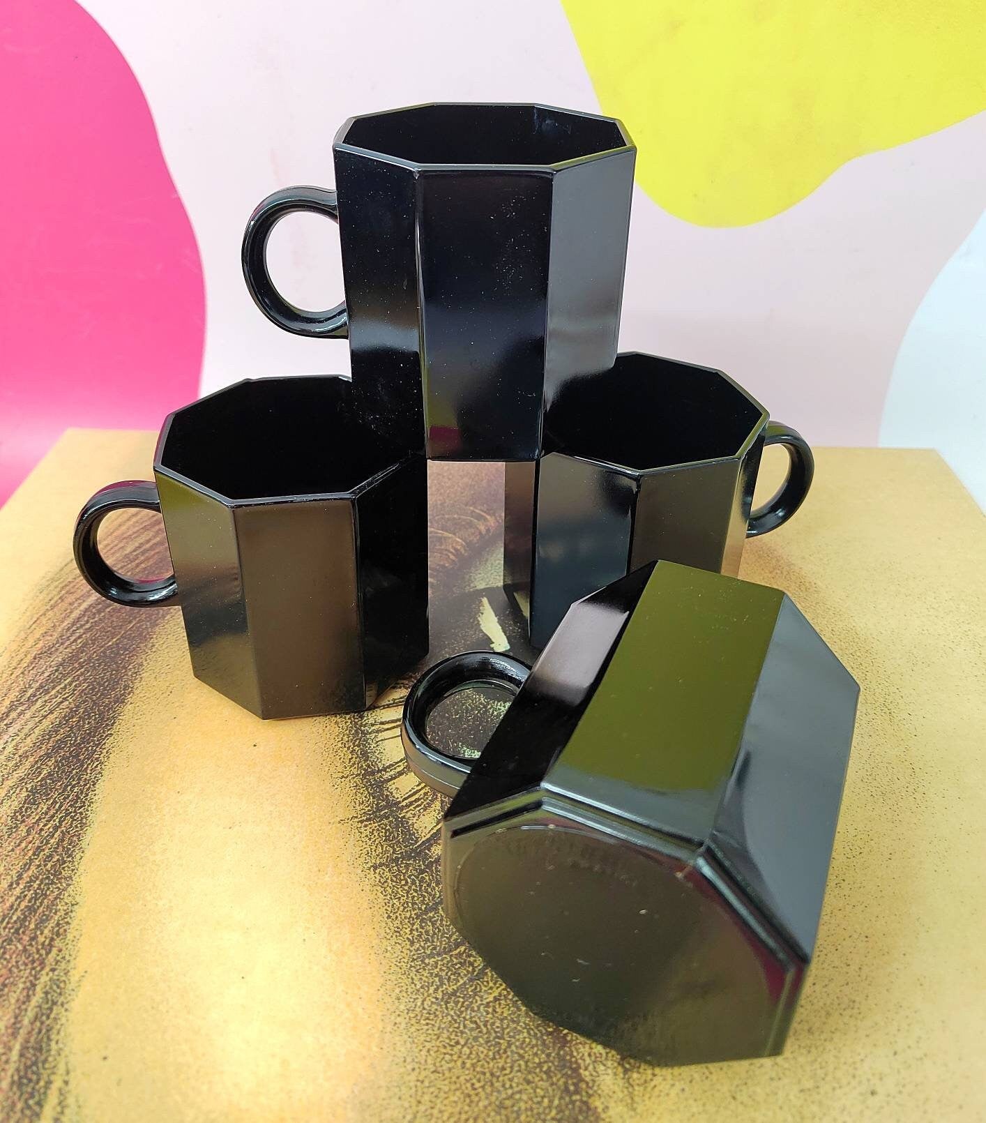 Wonderfully 80's set of 4 Vintage French black glass octagonal shaped mugs.