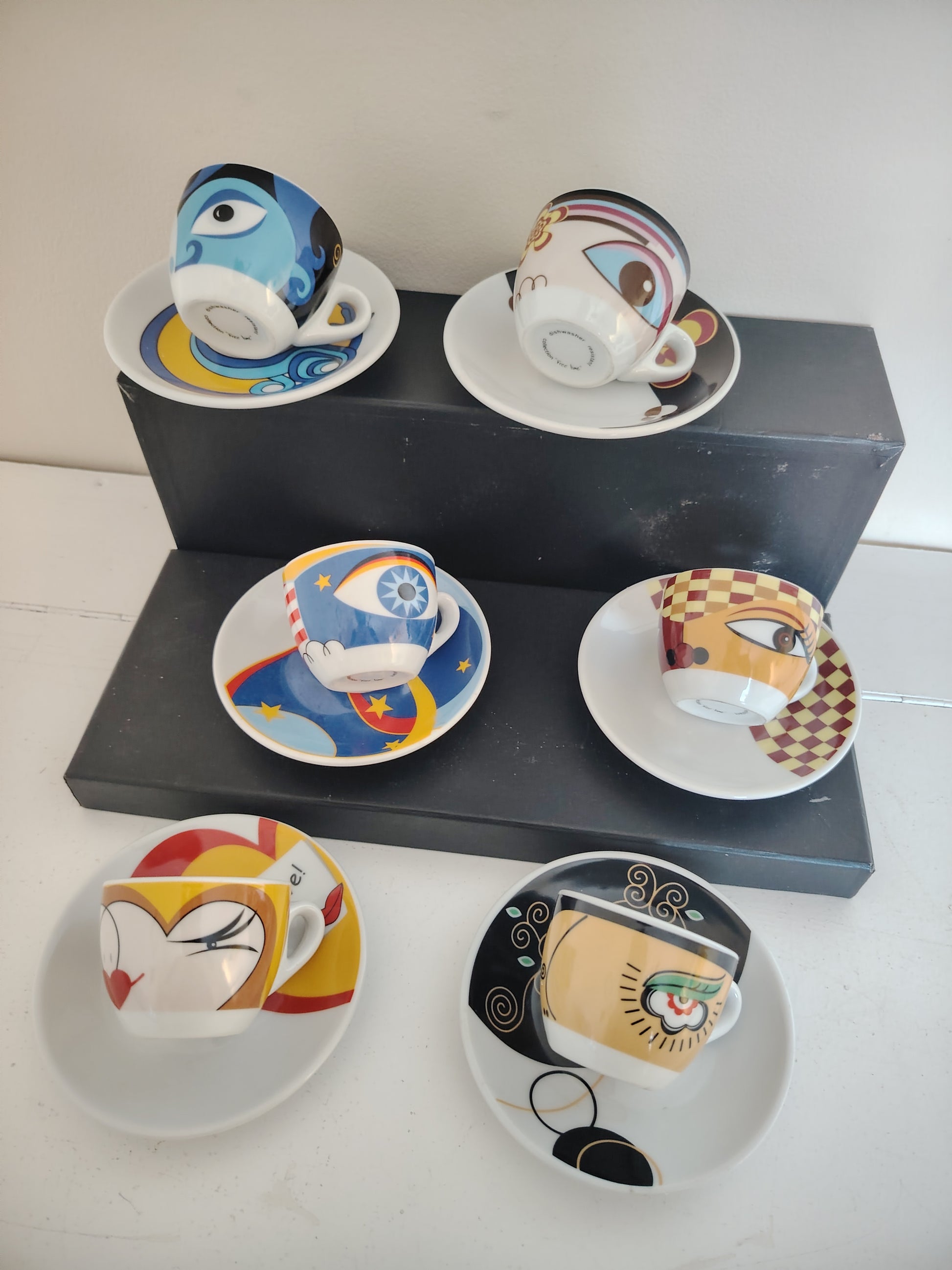 Fabulous set of 6 boxed 00's espresso cups and saucers, each with a different funky eye design.