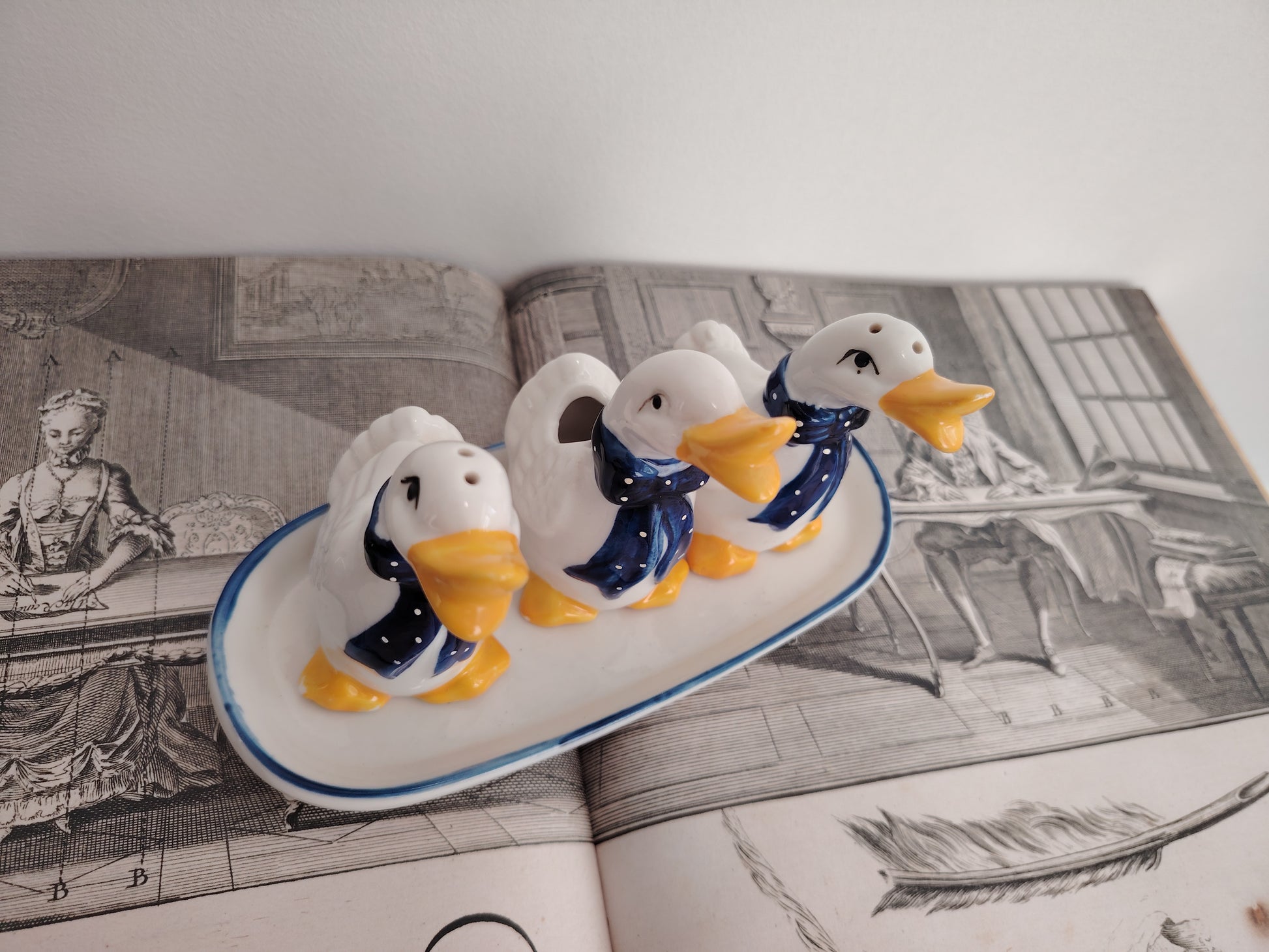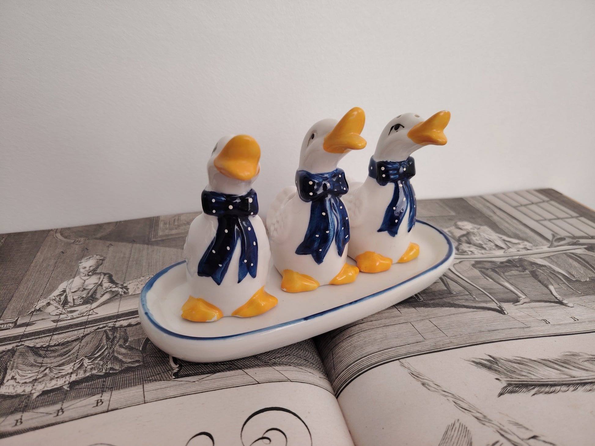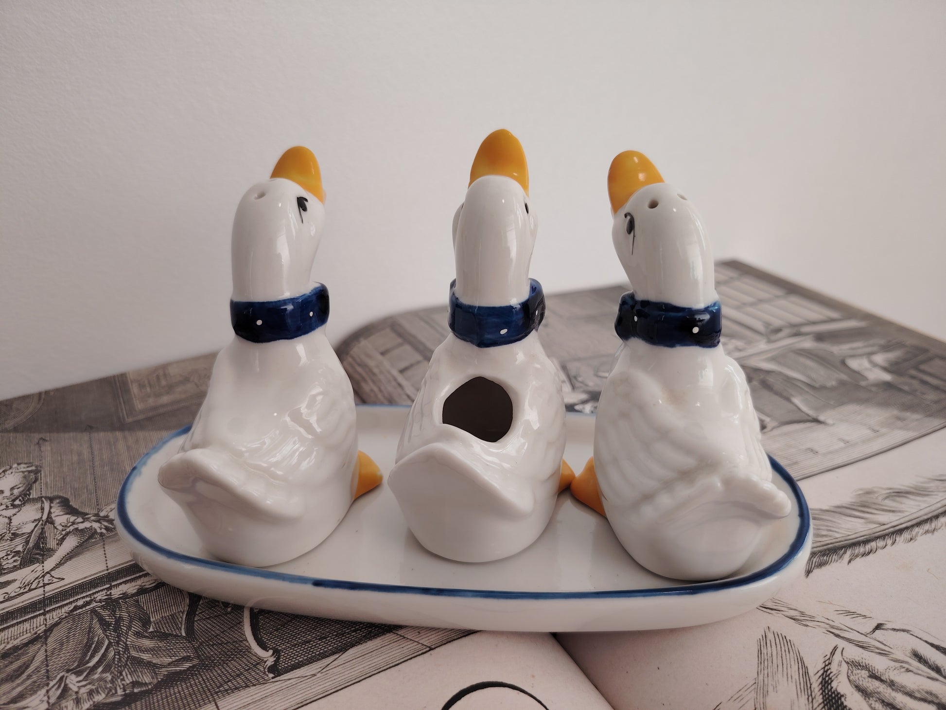 Fun little ceramic Cruet set with 3 geese/ Ducks in blue bows.