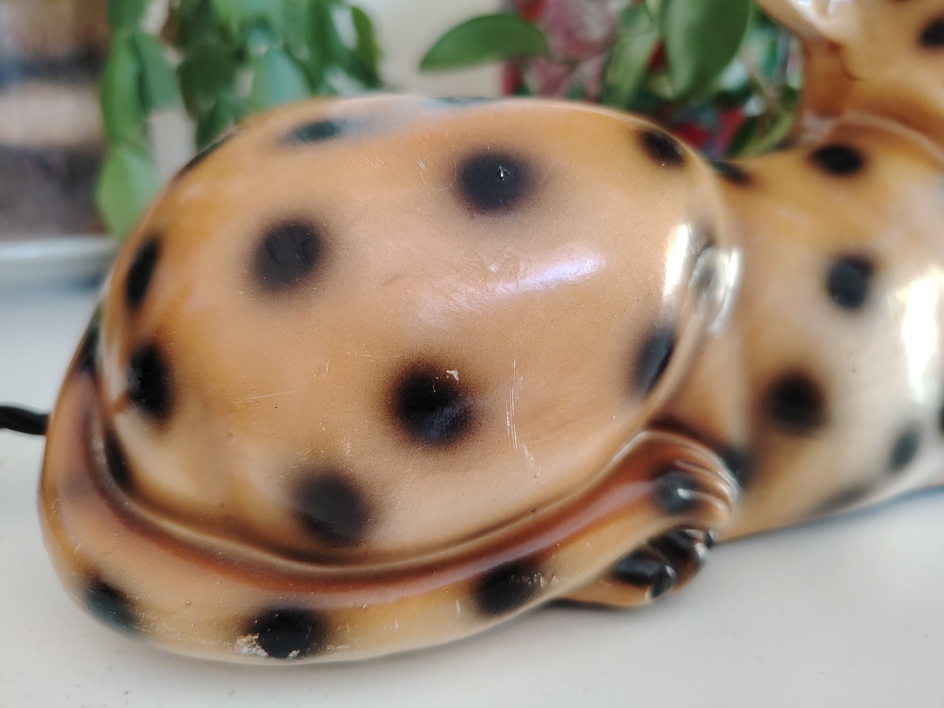 Amazing and extra special handmade lamp, upcycled by myself from a sweet chalkware ceramic Mid Century Italian Leopard Cub ornament and finished with a vintage mustard tassle shade.