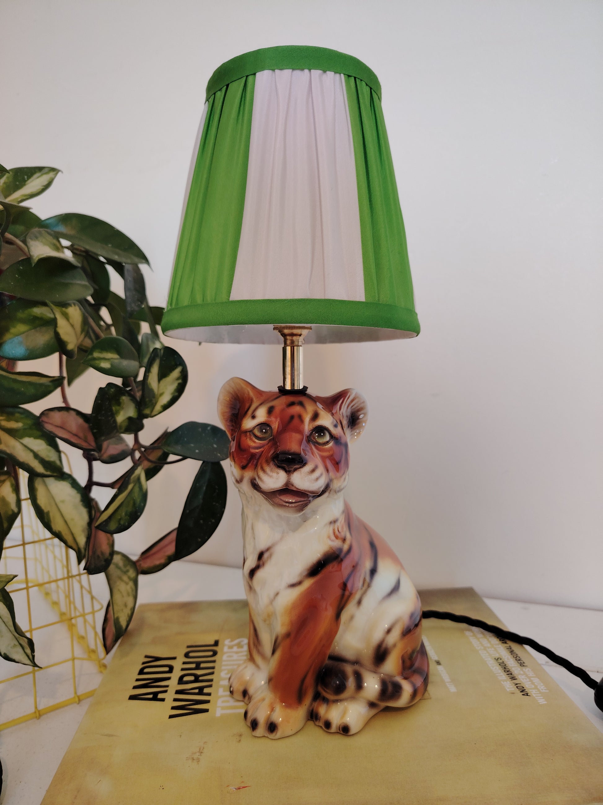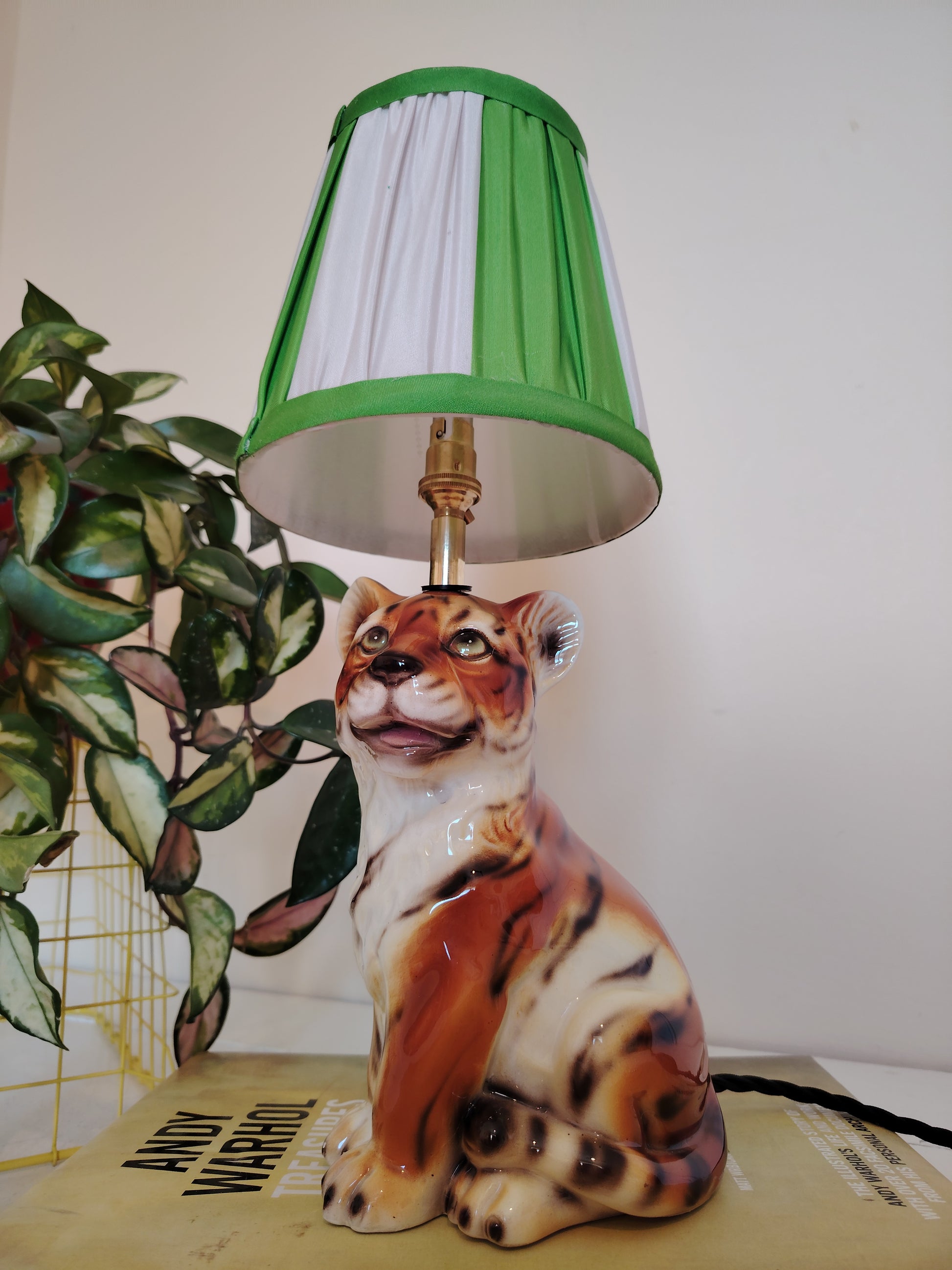 An extra special handmade lamp, upcycled by myself from a sweet ceramic Mid Century Italian Tiger Cub ornament and finished with a modern green and white clip on shade.