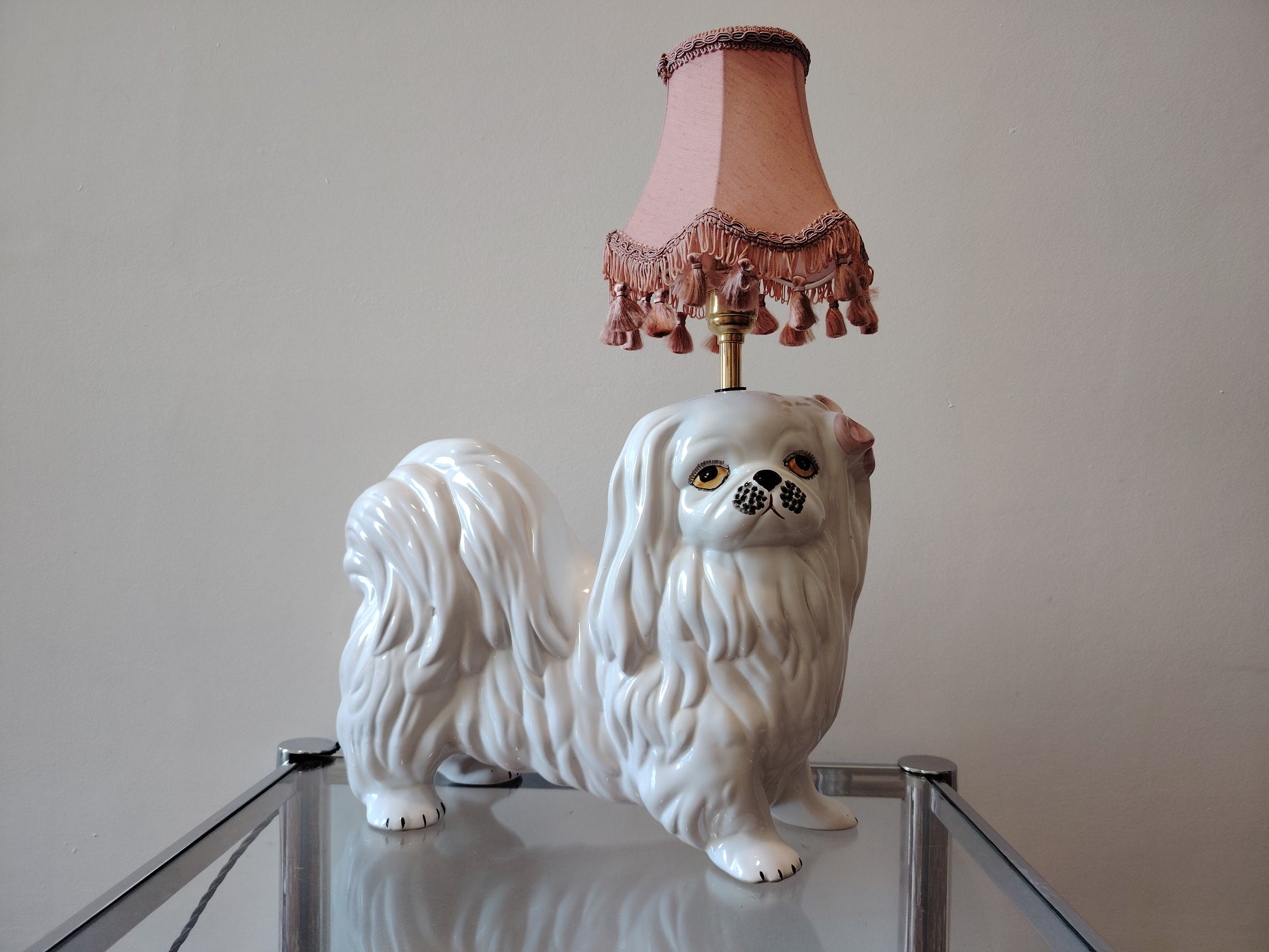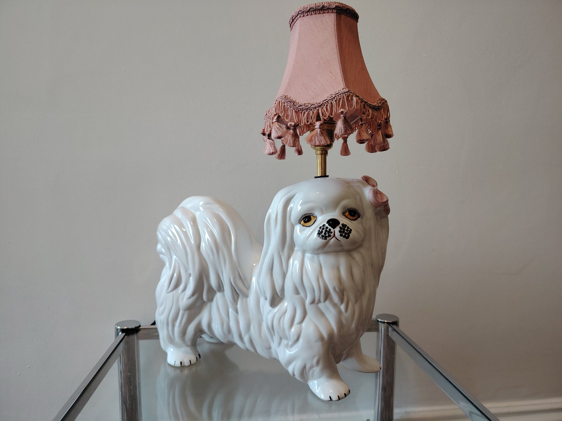 Amazing and extra special handmade lamp, upcycled by myself from a sweet ceramic Mid Century White Shitzu Dog with a lovely pink bow and finished with a vintage pink tassle shade.
