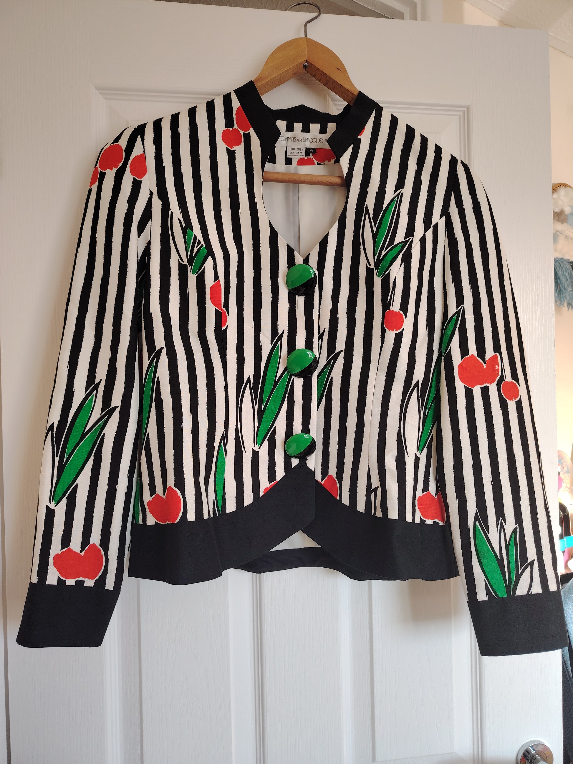 Black and white stripes with red and green tulip design and fabulous large black and green buttons.
