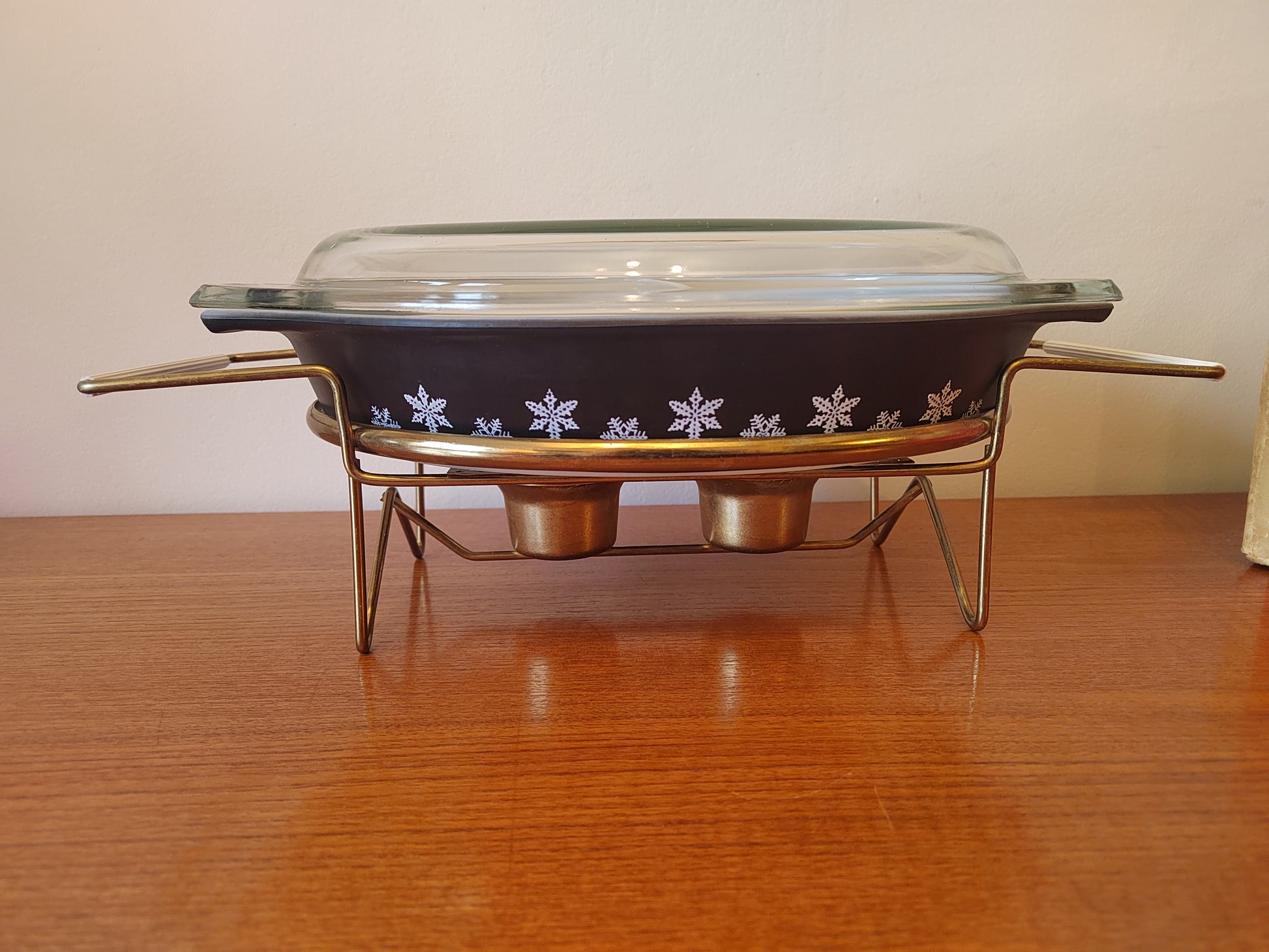 A glorious 1950's Pyrex gaiety divided vegetable dish with stand in black and white snowflake design .