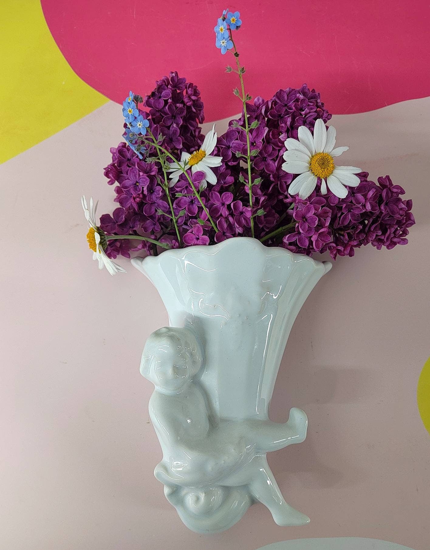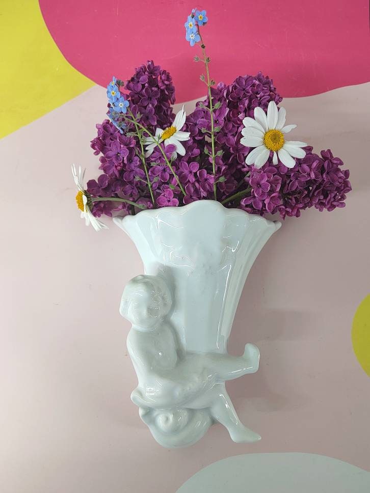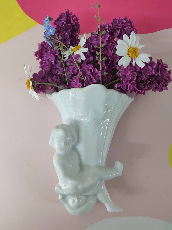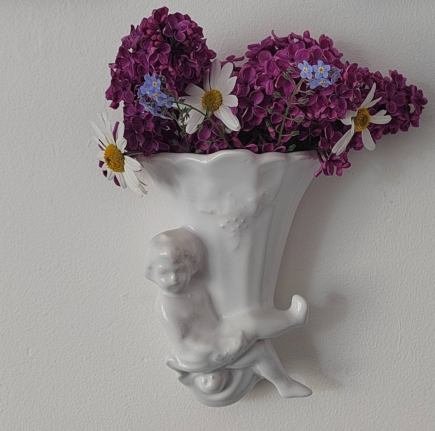 Lovely white ceramic cherub design wall pocket for floral displays.