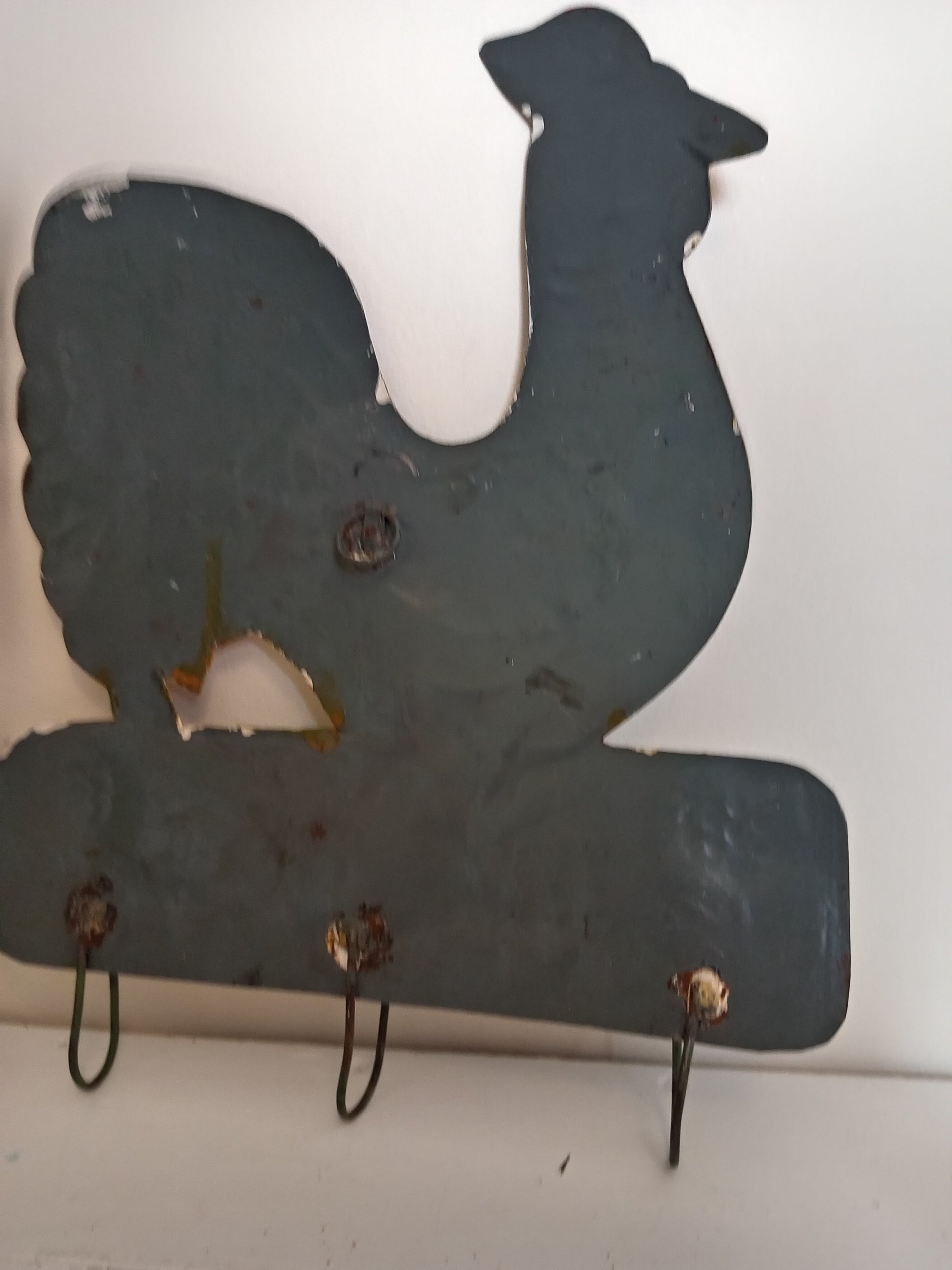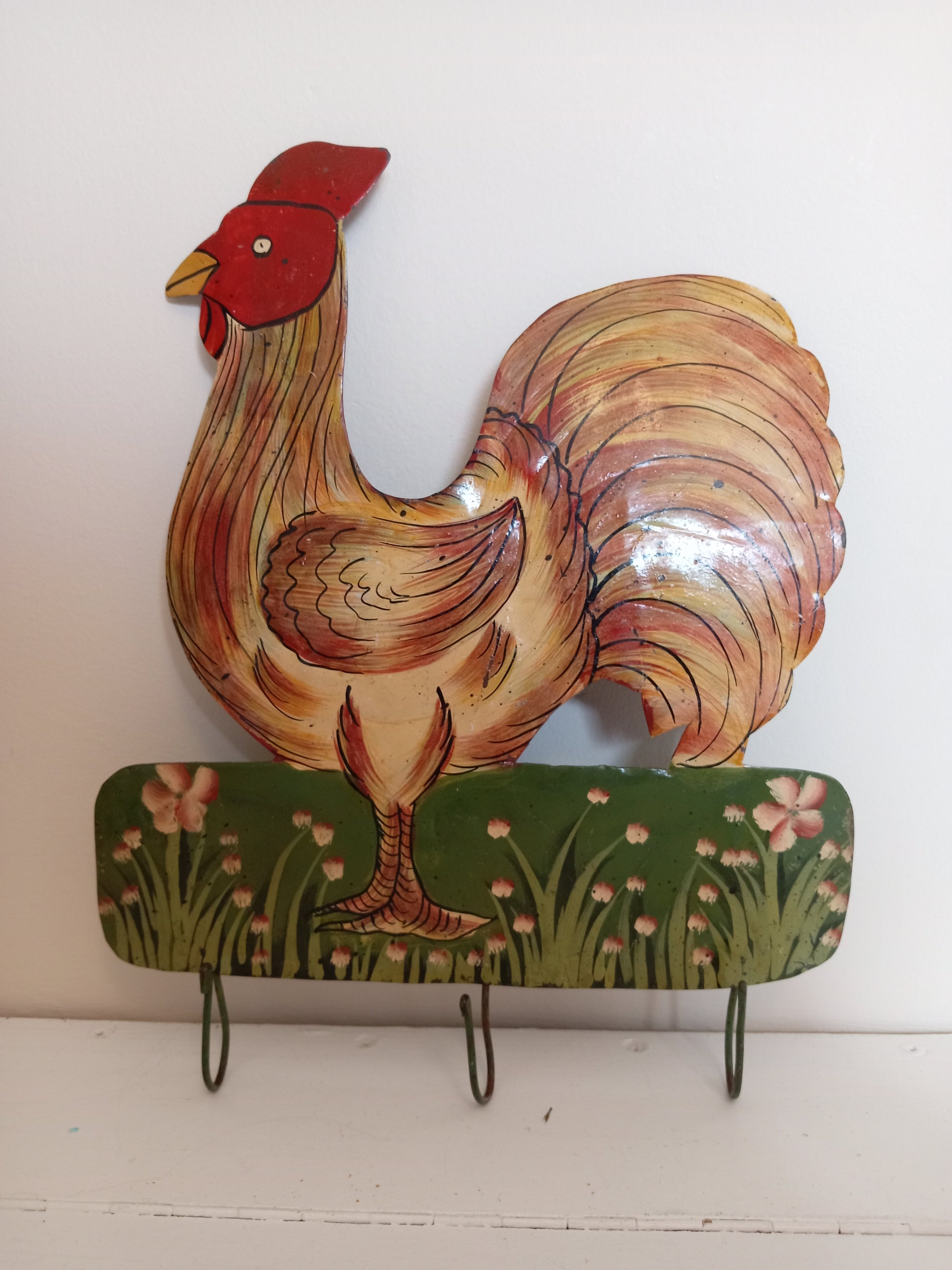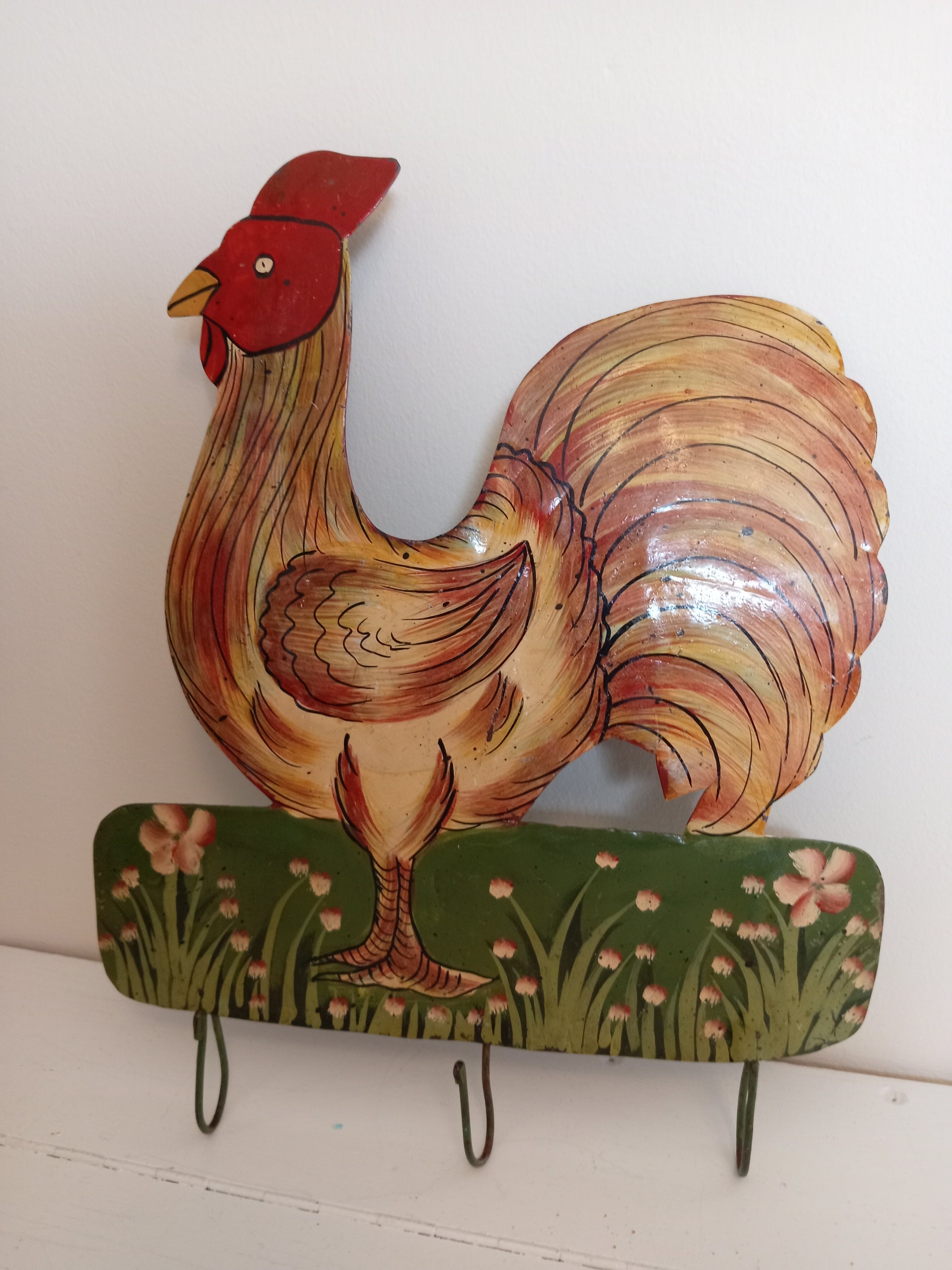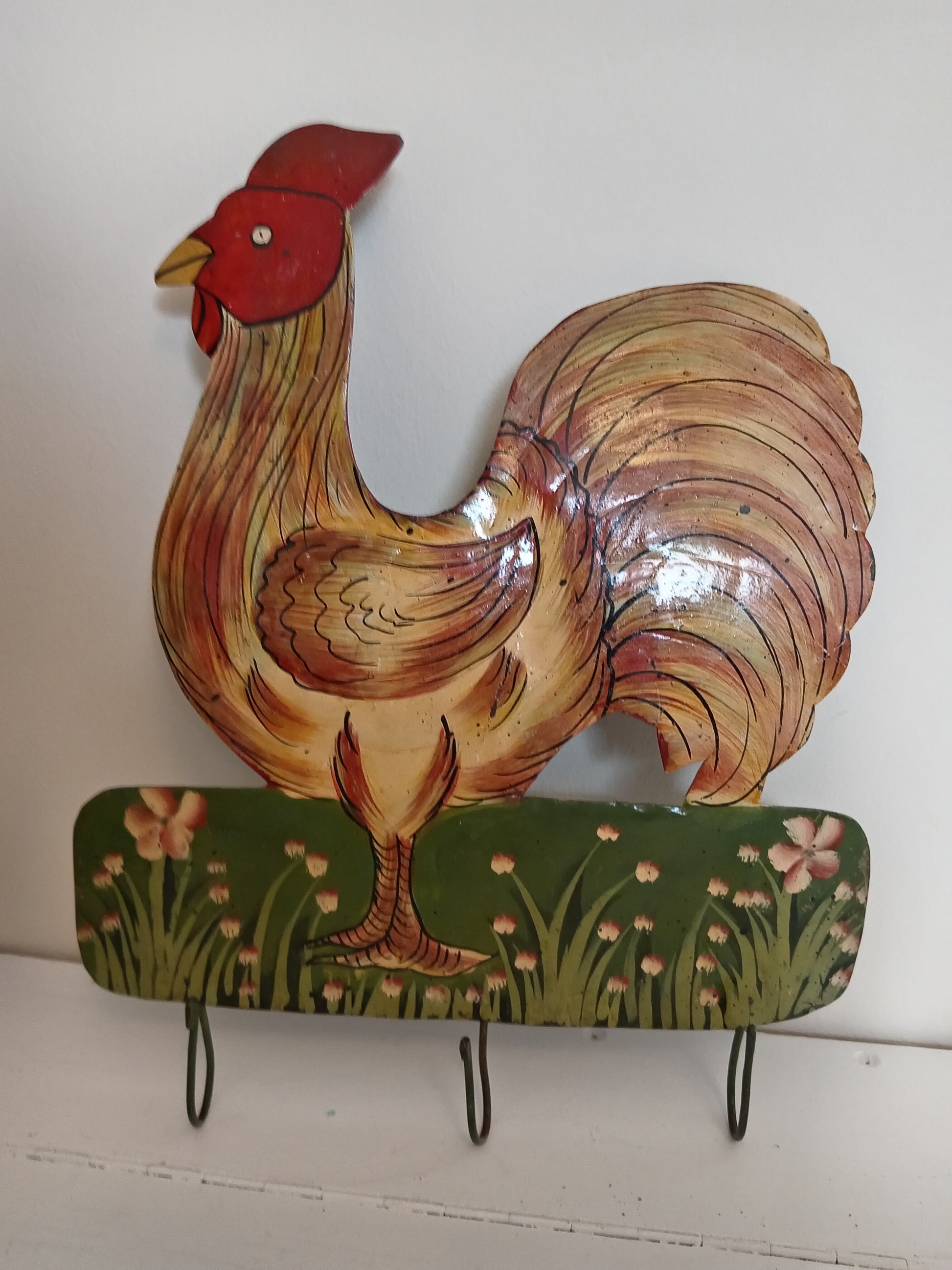 Fabulous Vintage metal hand painted chicken hook with 3 hooks.