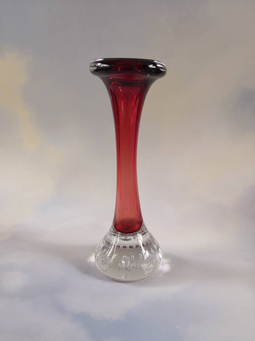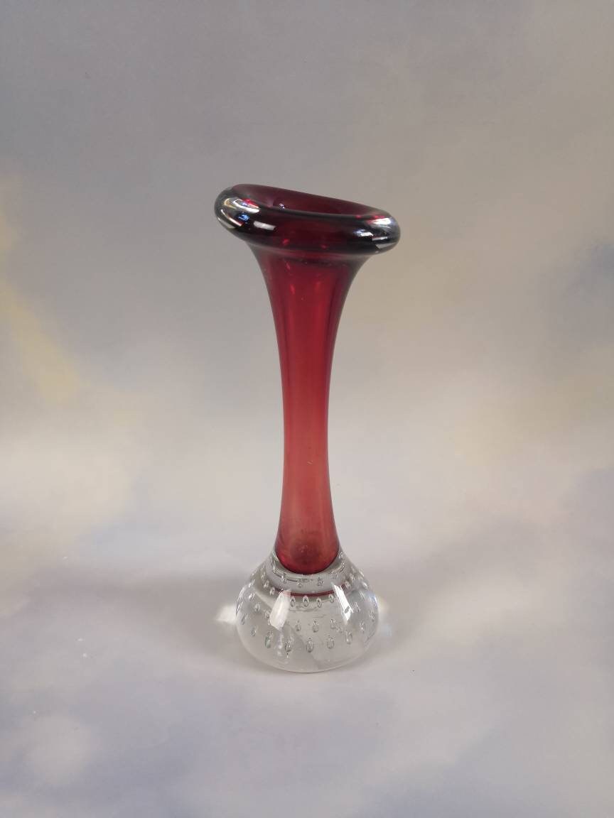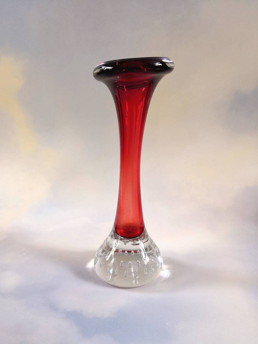 Lovely and iconic Swedish designed Aseda Glasbruk bud vase with heavy controlled bubble base with red stem.