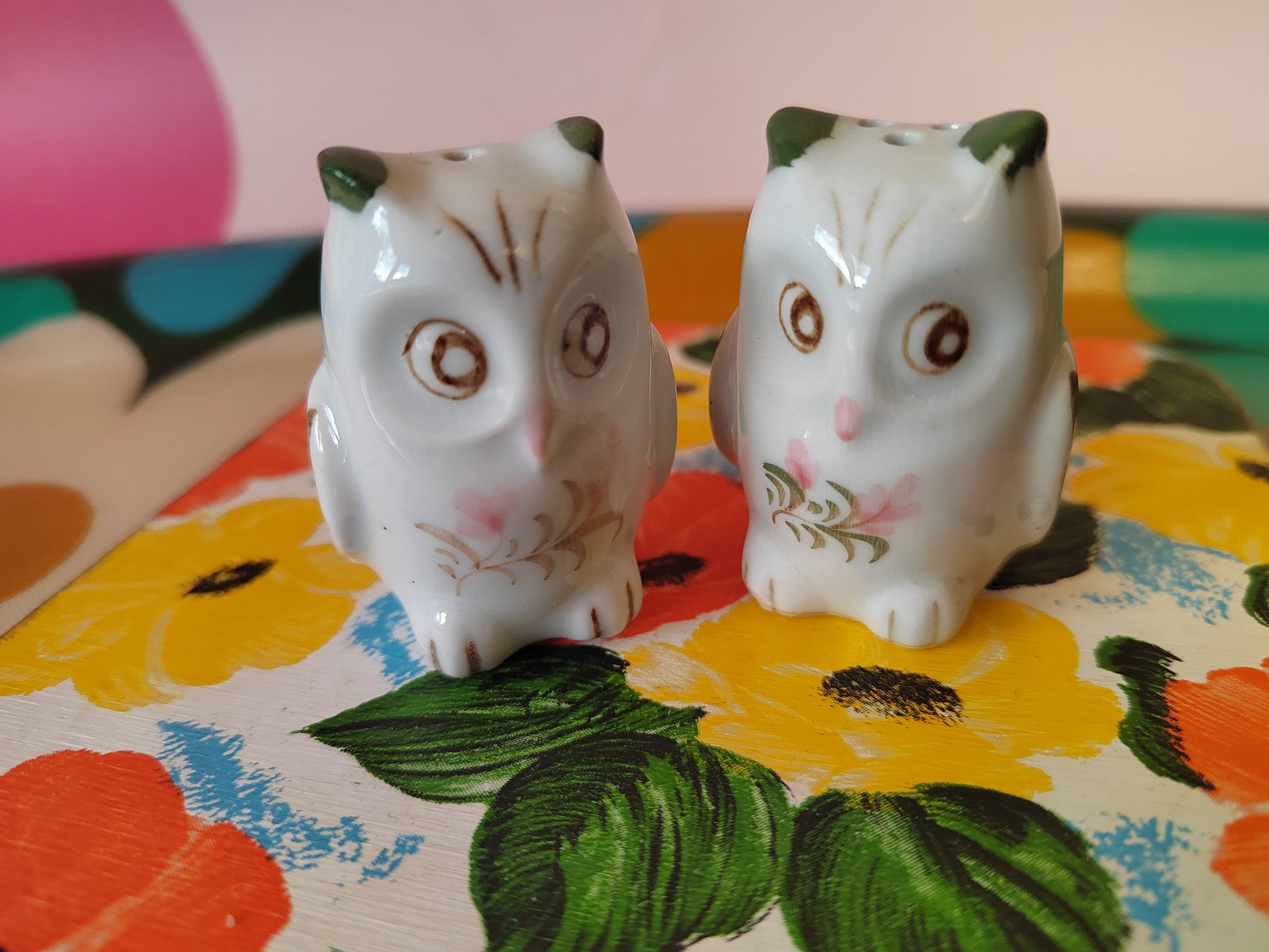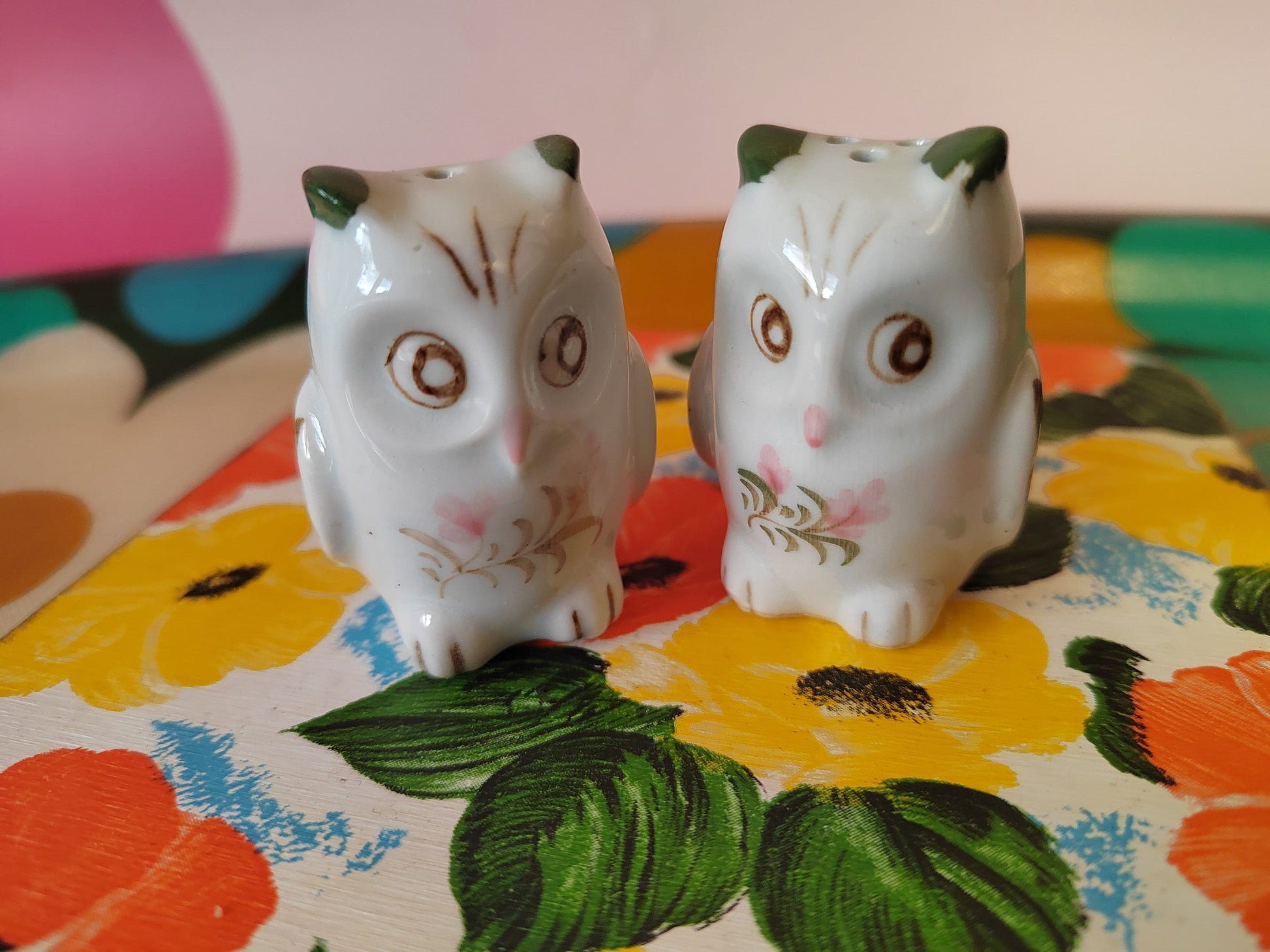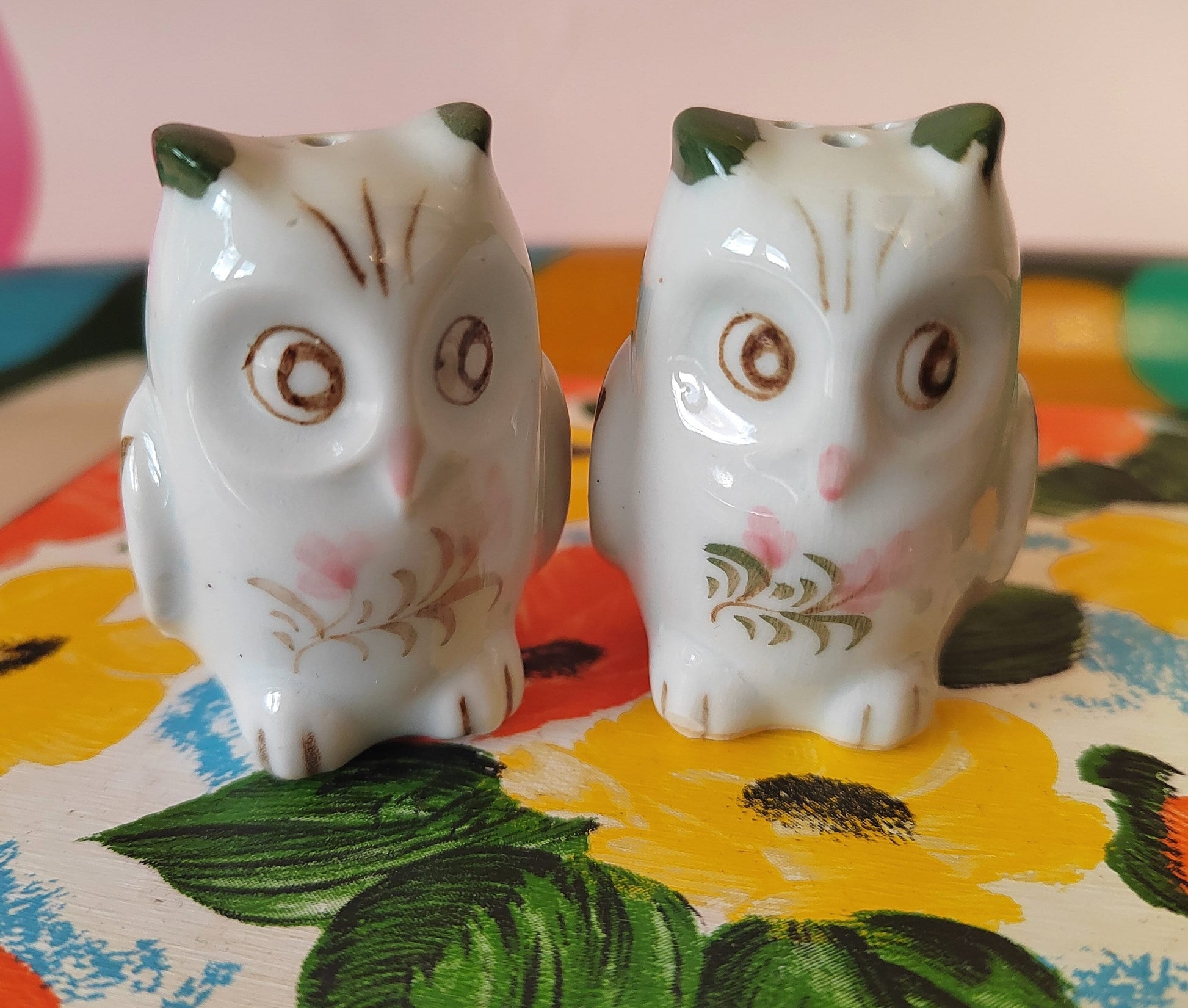 Super cute and tiny pair of vintage hand painted owls salt and pepper shakers with plastic stoppers.