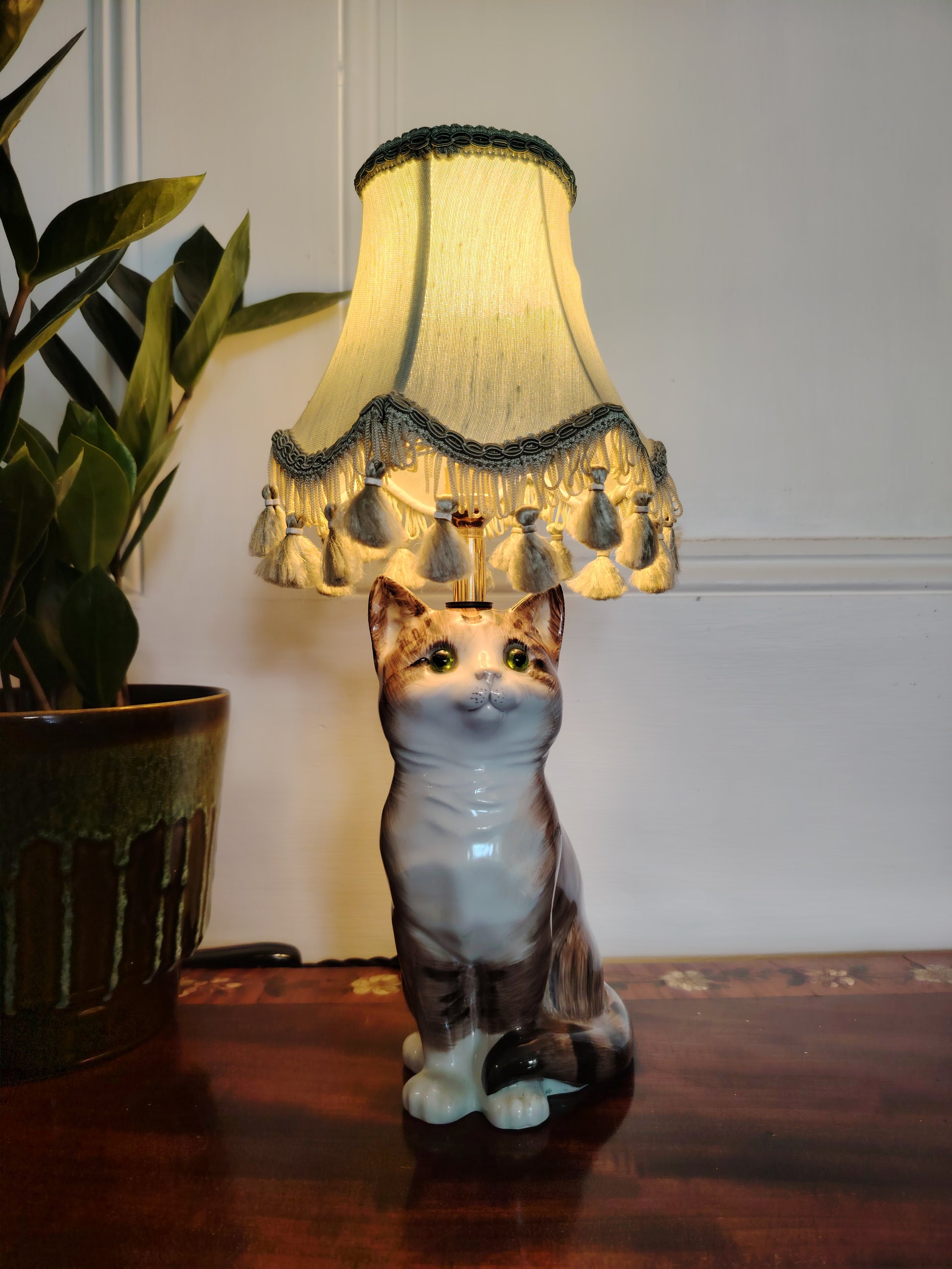 A beautiful and extra special handmade lamp, upcycled by myself from a sweet vintage tabby cat kitten ornament with green glass eyes.